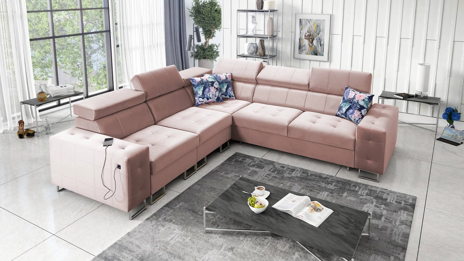 Narożnik Hampton III w kolorze kwarcowy róż z regulowanymi zagłówkami to elegancki mebel, który świetnie dopasuje się do każdej aranżacji w Twoim domu.