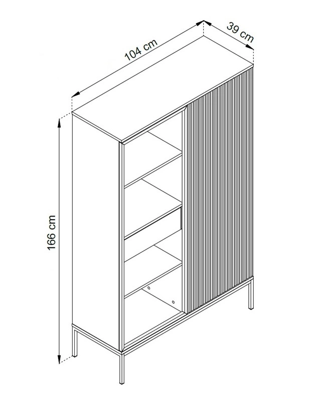 Ryflowane fronty zostały wykonane z płyty MDF o grubości 18mm. Korpus wykonany z wysokiej jakości płyty laminowanej, która charakteryzuje się odpornością na wpływ czynników zewnętrznych takich jak obicia, uderzenia i niefortunne zadrapania. Przeszklony front witryny wykonany jest z bezpiecznego szkła hartowanego w ciemnym odcieniu. Witryna wyposażona jest w dyskretne oświetlenie LED, dzięki niemu bryła zyskuje wizualną lekkość oraz funkcjonalność. Konstrukcja mebla została wzmocniona gustownymi metalowymi nogami w kolorze złotym.