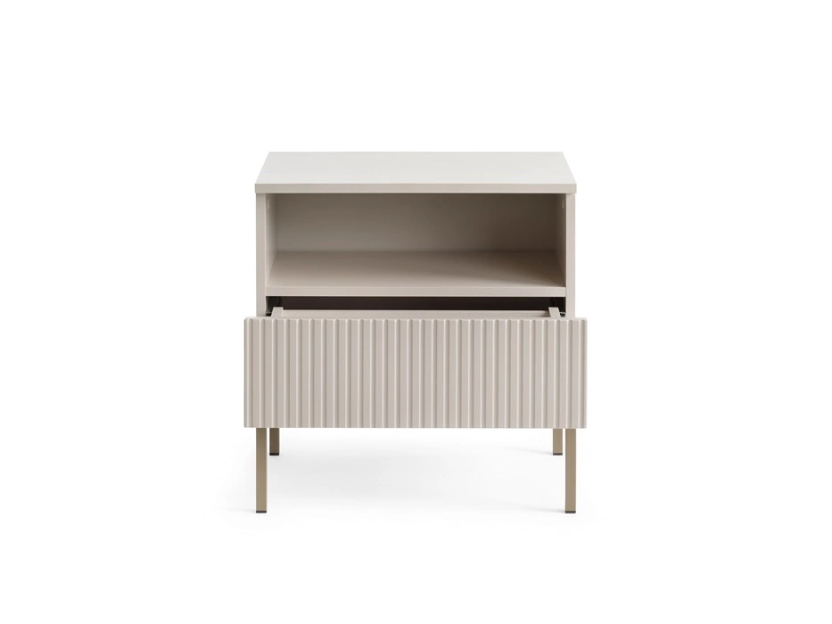 Szafka nocna z szufladą Amma beżowa gustowny ryflowany dekor oświetlenie LED idealna szafka do sypialni