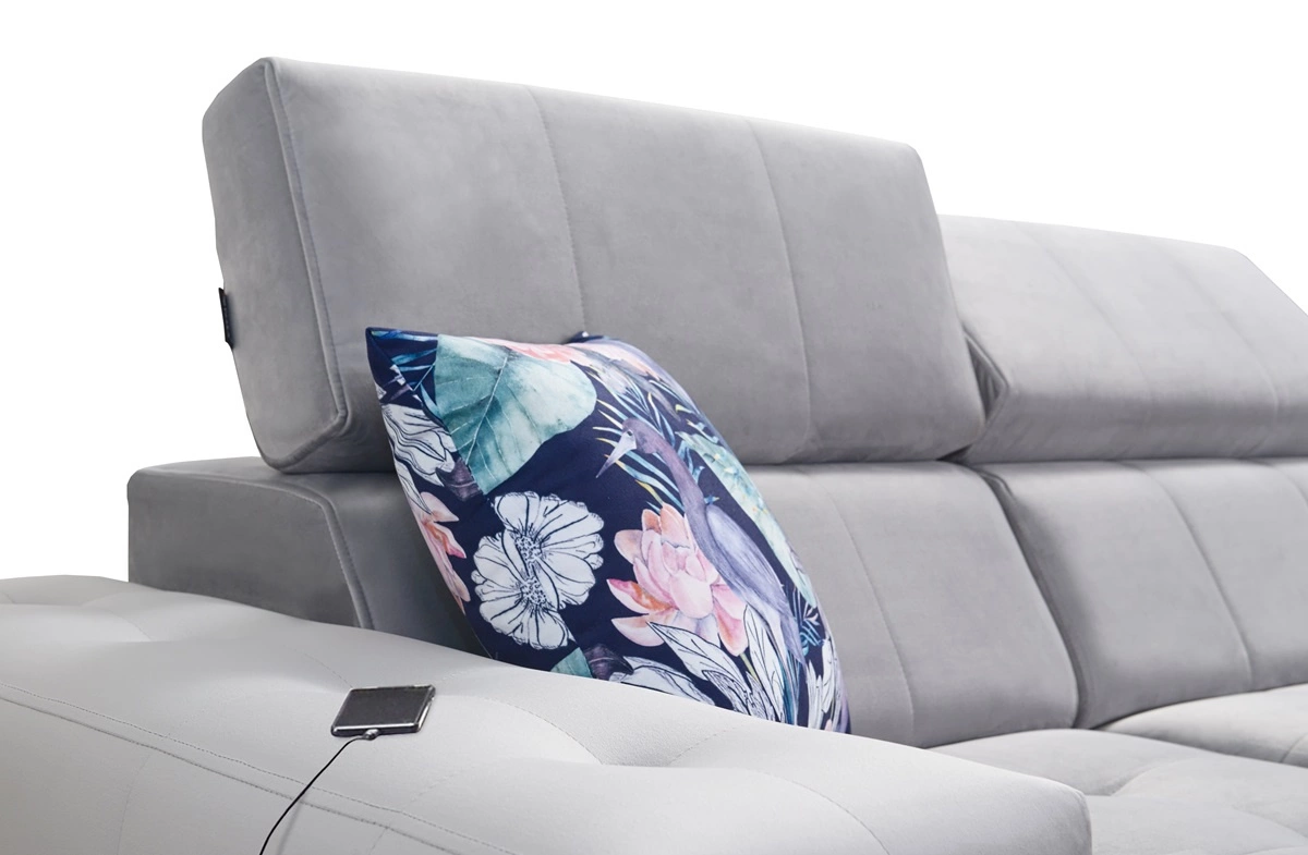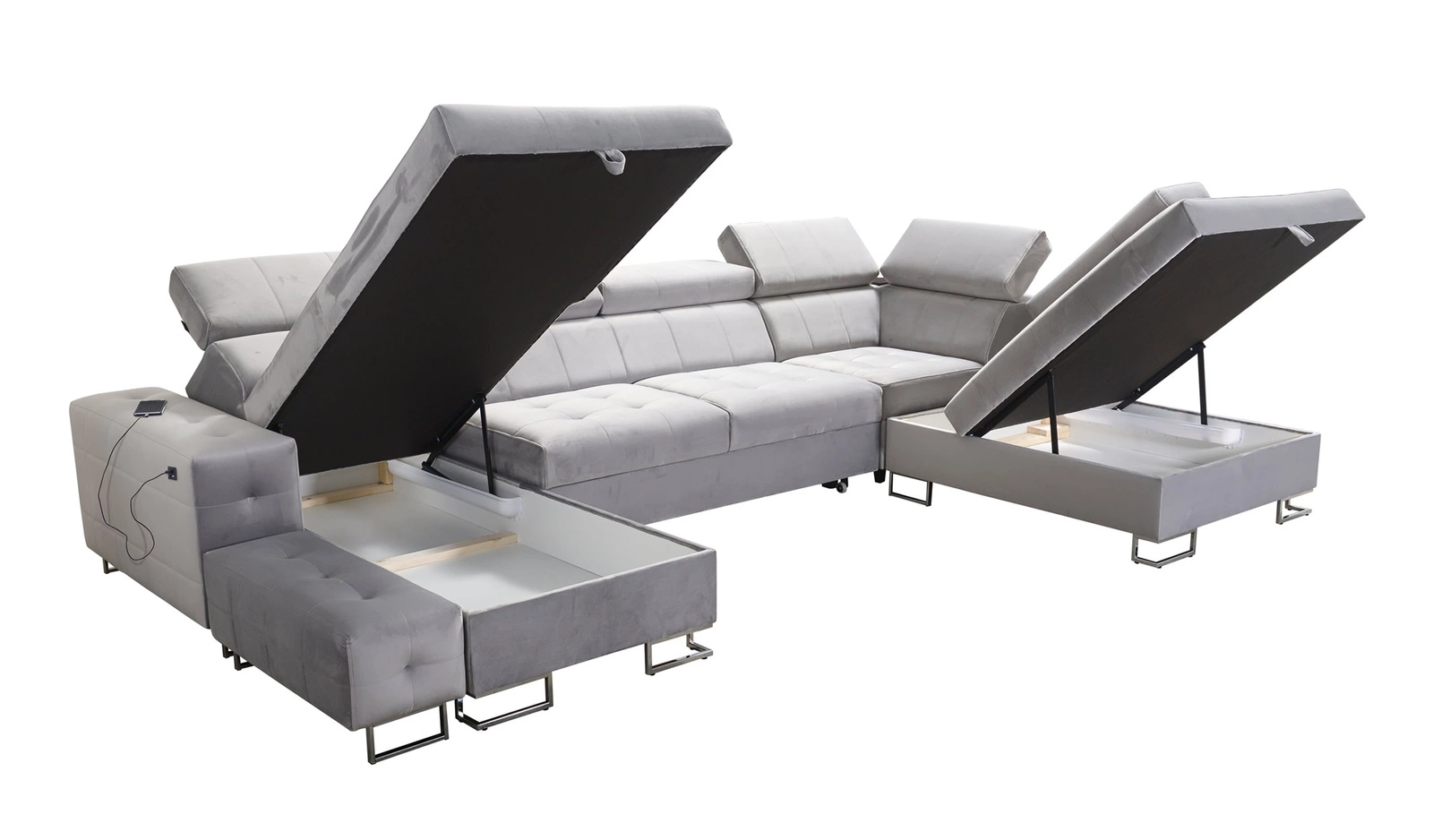 Dodatki tego mebla, które docenią wszyscy użytkownicy to pojemniki na pościel, funkcja spania, regulowane zagłówki, gniazdo ładowania USB, półka oraz ruchoma dostawka.