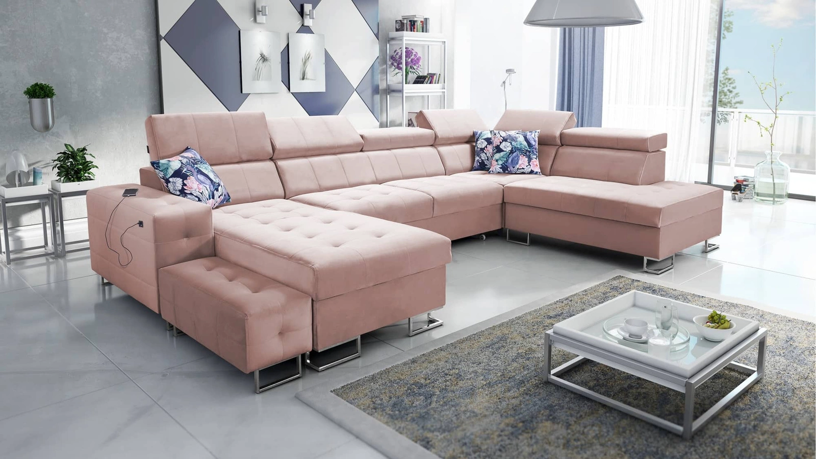 Narożnik Hampton VI w kolorze kwarcowy róż z regulowanymi zagłówkami to elegancki mebel, który świetnie dopasuje się do każdej aranżacji w Twoim domu.