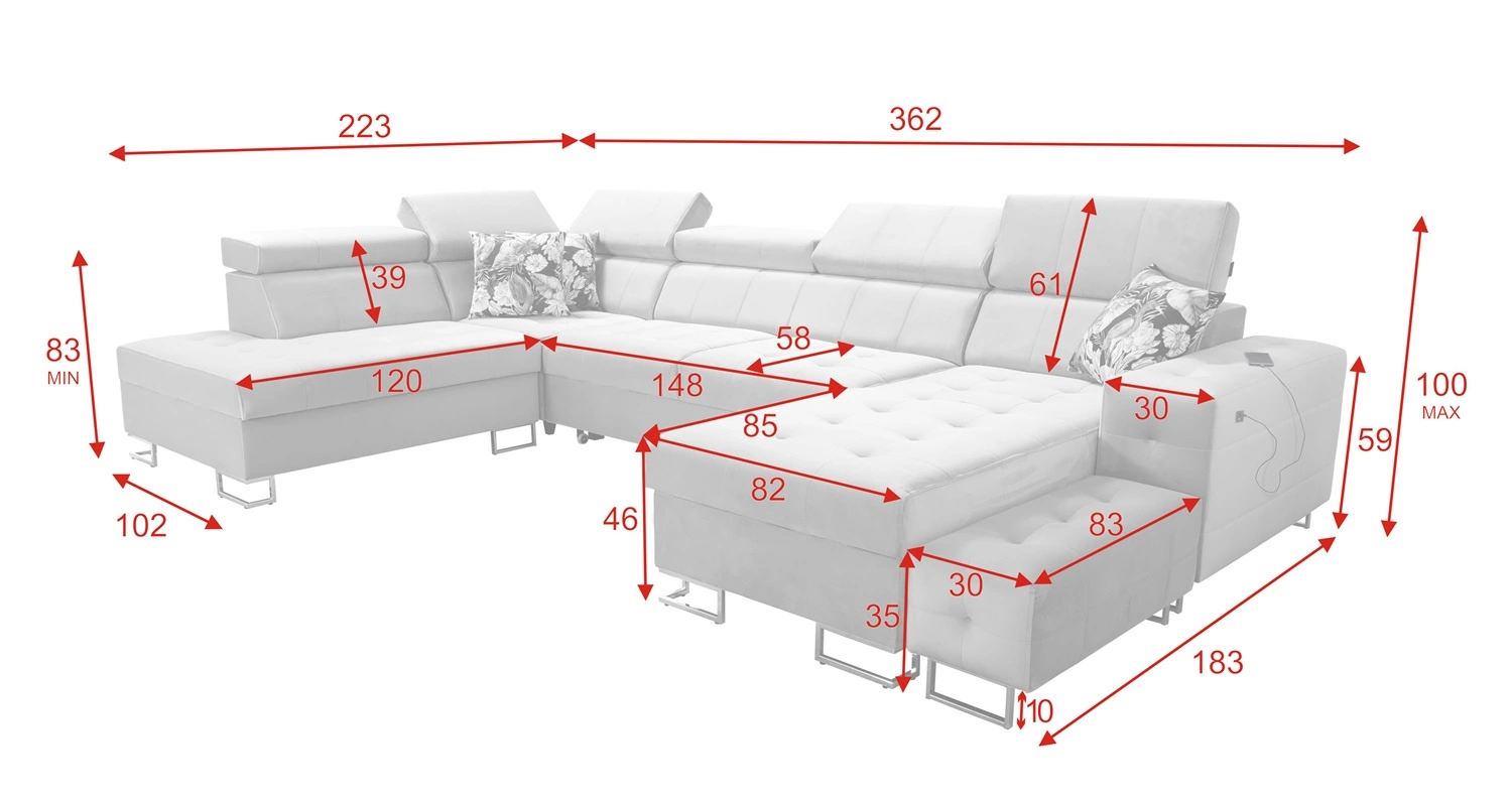 Wymiary mebla pozwolą na zapełnienie przestrzeni w przestronnym salonie lub pokoju dziennym. Szerokość narożnika 362 cm, wysokość maksymalna 100 cm oraz głębokość 223 cm. Powierzchnia spania narożnika wynosi 127x284 cm. Wysokość siedziska mebla to 46 cm a maksymalna wysokość oparcia wynosi 61 cm. Sprężyny faliste oraz pianka poliuretanowa T30 to materiał, z którego wykonane zostało siedzisko narożnika. Oparcie z regulowanymi zagłówkami pozwoli na łatwe dostosowanie kąta nachylenia zagłówków do swoich preferencji oraz daje gwarancję wygodnego wypoczynku po długim dniu, które docenisz Ty, Twoi bliscy a także goście, którzy zasiądą na tym wyjątkowym narożniku.