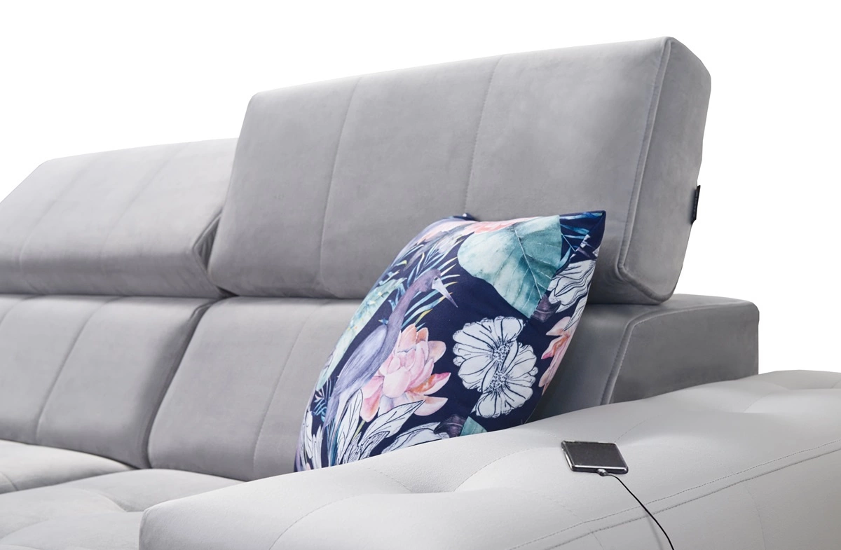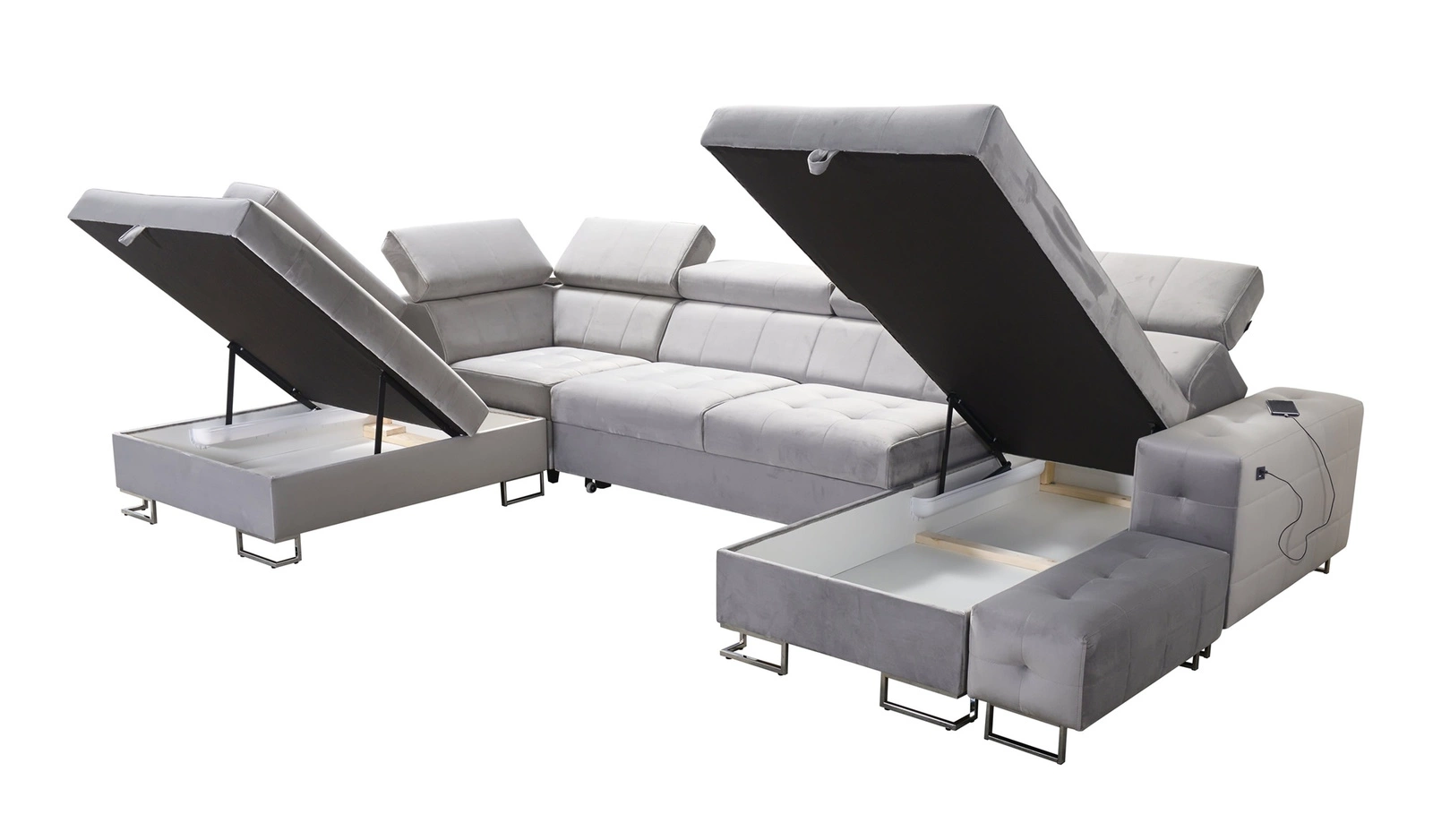 Dodatki tego mebla, które docenią wszyscy użytkownicy to pojemniki na pościel, funkcja spania, regulowane zagłówki, gniazdo ładowania USB, półka oraz ruchoma dostawka.