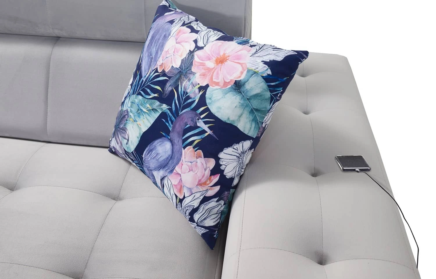 Dodatki tego mebla, które docenią wszyscy użytkownicy to pojemnik na pościel, funkcja spania, regulowane zagłówki, półka oraz gniazdo ładowania USB.