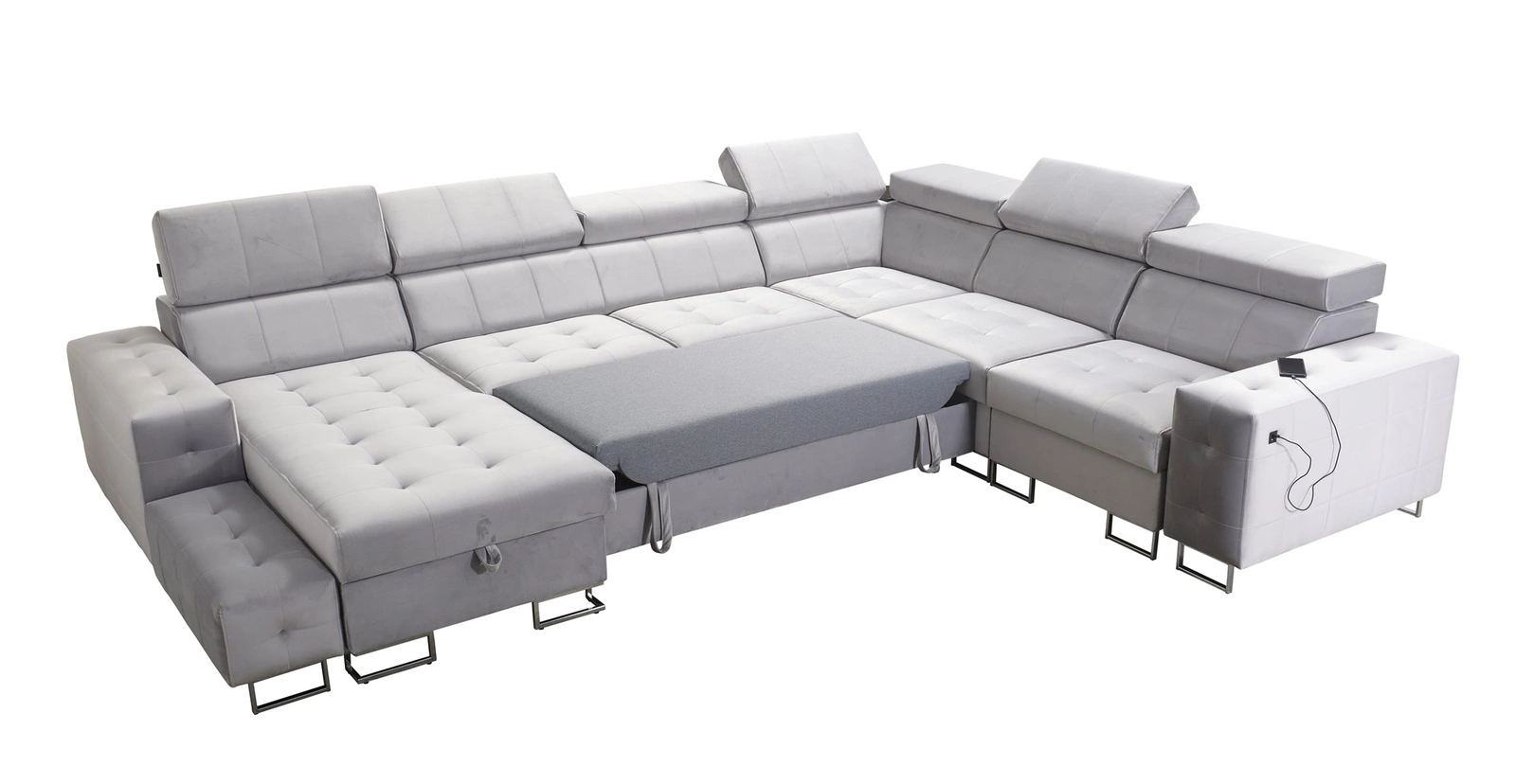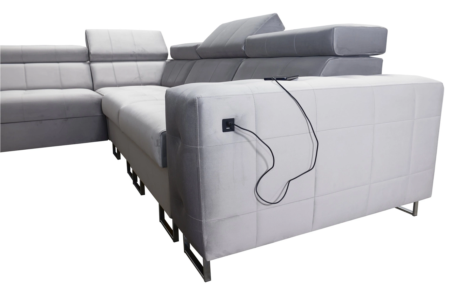 Dodatki tego mebla, które docenią wszyscy użytkownicy to pojemniki na pościel, funkcja spania, regulowane zagłówki, gniazdo ładowania USB oraz ruchoma dostawka.