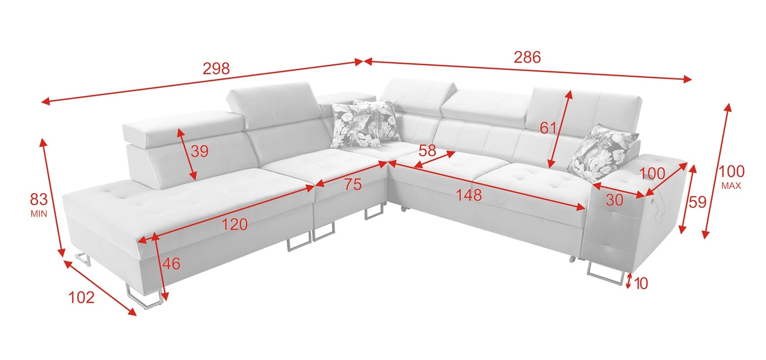 Wymiary mebla pozwolą na zapełnienie przestrzeni w przestronnym salonie lub pokoju dziennym. Szerokość narożnika 286 cm, wysokość maksymalna 100 cm oraz głębokość 298 cm. Powierzchnia spania narożnika wynosi 127x210 cm. Wysokość siedziska mebla to 46 cm a maksymalna wysokość oparcia wynosi 61 cm. Sprężyny faliste oraz pianka poliuretanowa T30 to materiał, z którego wykonane zostało siedzisko narożnika. Oparcie z regulowanymi zagłówkami pozwoli na łatwe dostosowanie kąta nachylenia zagłówków do swoich preferencji oraz daje gwarancję wygodnego wypoczynku po długim dniu, które docenisz Ty, Twoi bliscy a także goście, którzy zasiądą na tym wyjątkowym narożniku.