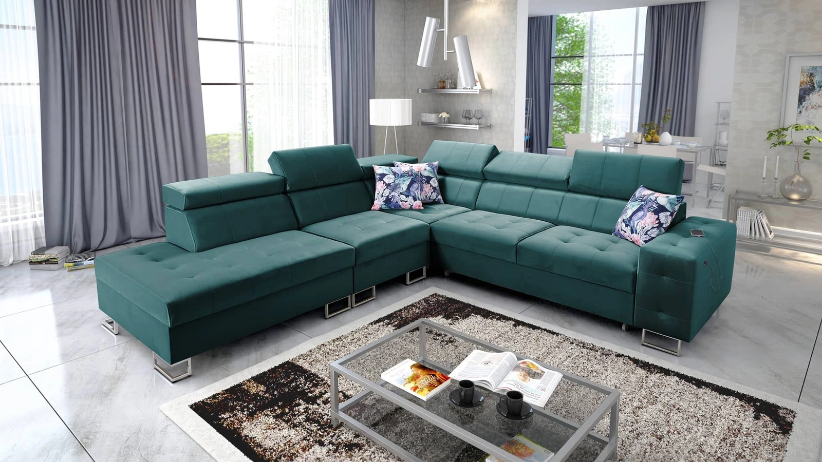 Narożnik Hampton IX w kolorze morskim z regulowanymi zagłówkami to elegancki mebel, który świetnie dopasuje się do każdej aranżacji w Twoim domu.