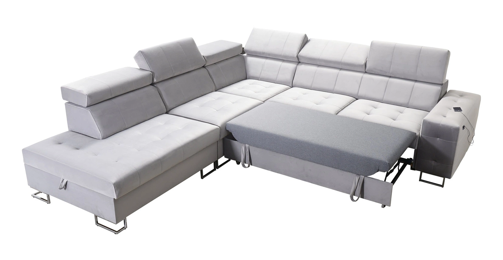 Dodatki tego mebla, które docenią wszyscy użytkownicy to pojemnik na pościel, funkcja spania, regulowane zagłówki, półka oraz gniazdo ładowania USB.
