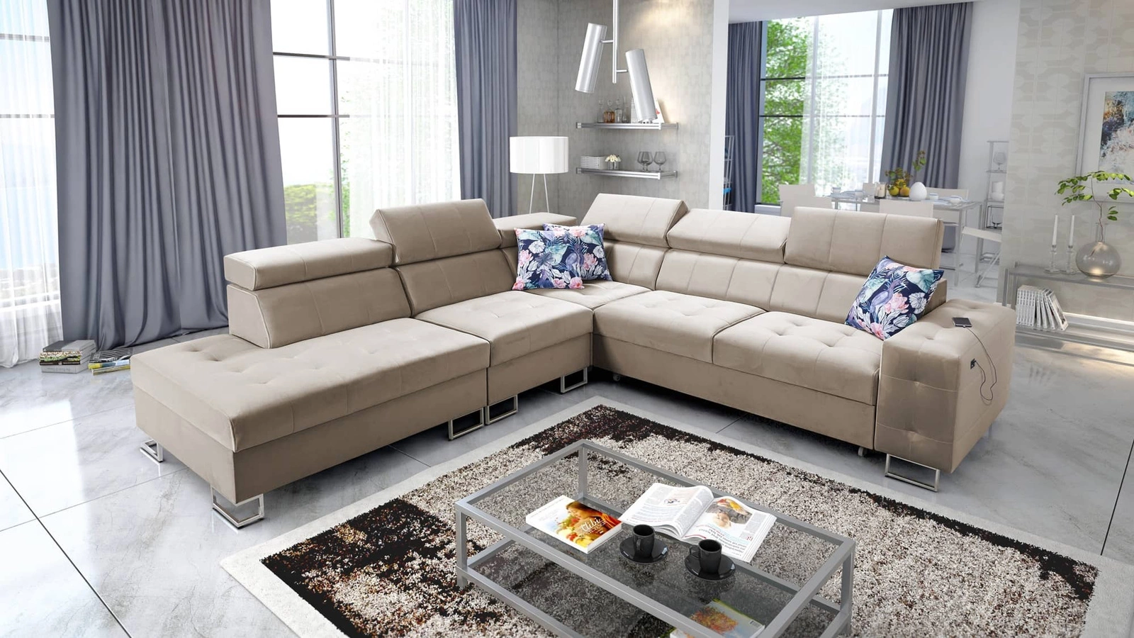 Narożnik z funkcją spania Hampton IX beżowy lewostronny stylowy i nowoczesny design narożnika idealny mebel do każdej aranżacji