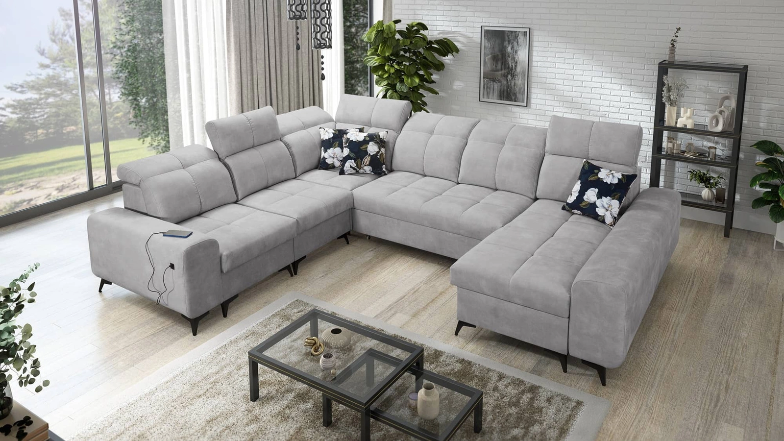 Dodatki tego mebla, które docenią wszyscy użytkownicy to aż trzy pojemniki na pościel, regulowane zagłówki oraz gniazdo ładowania USB w boczku narożnika.