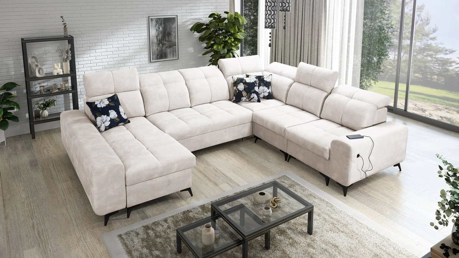 Dodatki tego mebla, które docenią wszyscy użytkownicy to aż trzy pojemniki na pościel, regulowane zagłówki oraz gniazdo ładowania USB w boczku narożnika.