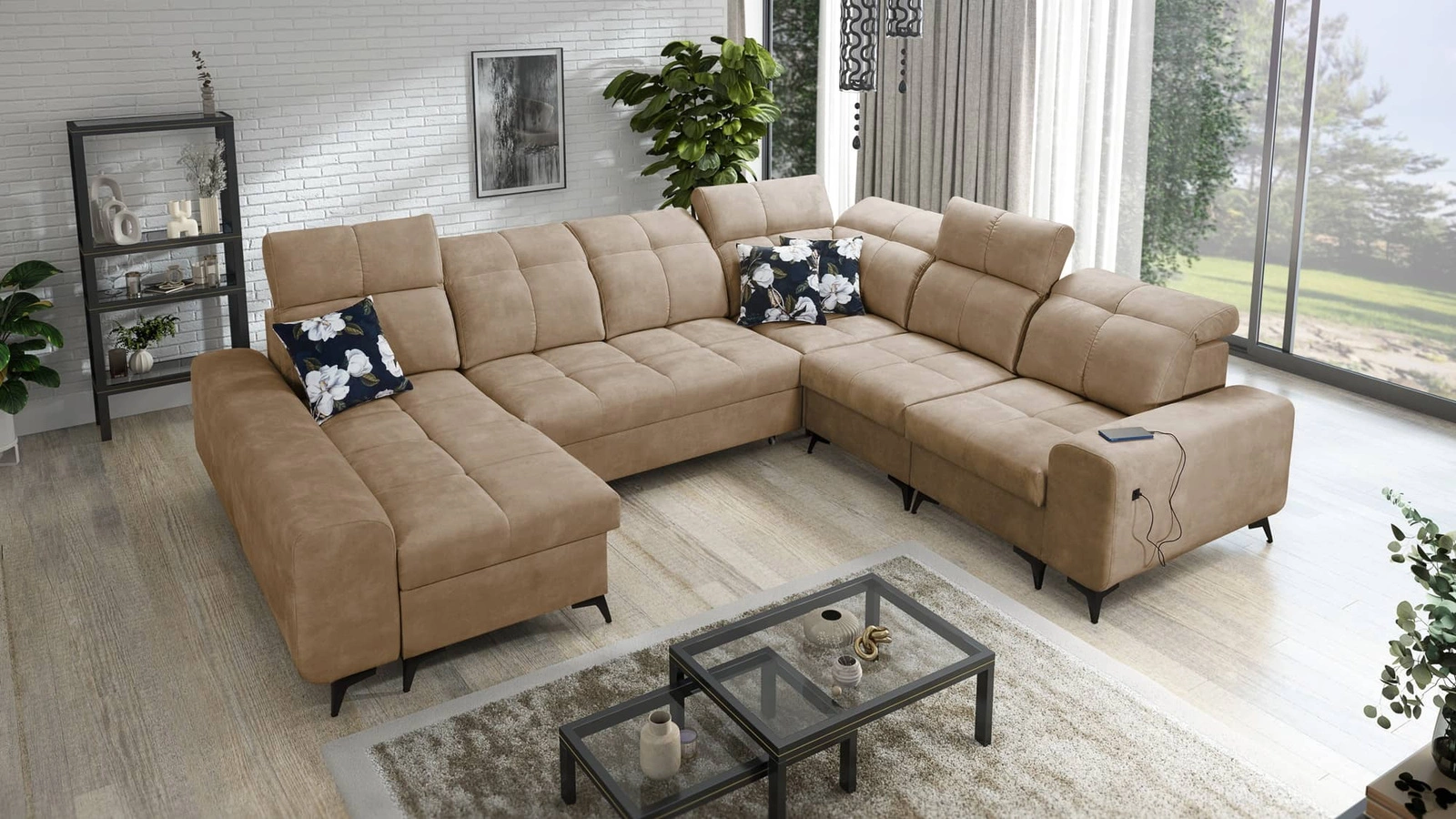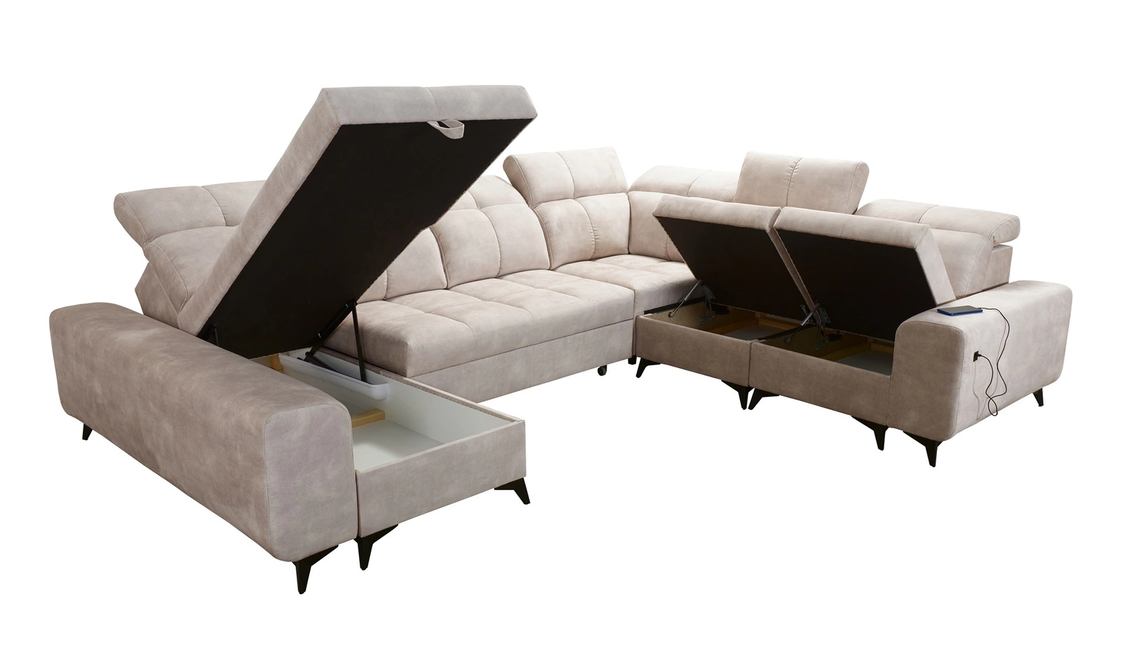 Dodatki tego mebla, które docenią wszyscy użytkownicy to aż trzy pojemniki na pościel, regulowane zagłówki oraz gniazdo ładowania USB w boczku narożnika.