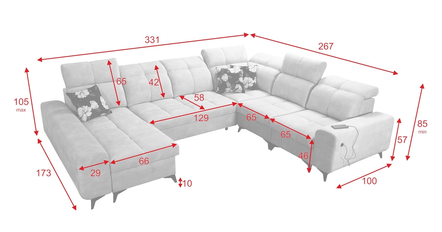 Wymiary mebla pozwolą na zapełnienie przestrzeni w przestronnym salonie lub pokoju dziennym. Szerokość narożnika 331 cm, wysokość maksymalna 105 cm oraz głębokość 267 cm. Powierzchnia spania narożnika wynosi 129x255 cm. Wysokość siedziska mebla to 46 cm a maksymalna wysokość oparcia wynosi 65 cm. Sprężyny faliste oraz pianka poliuretanowa T30 to materiał, z którego wykonane zostało siedzisko narożnika. Oparcie stałe z regulowanymi zagłówkami pozwoli na łatwe dostosowanie kąta nachylenia zagłówków do swoich preferencji oraz daje gwarancję wygodnego wypoczynku po długim dniu, które docenisz Ty, Twoi bliscy a także goście, którzy zasiądą na tym wyjątkowym narożniku.