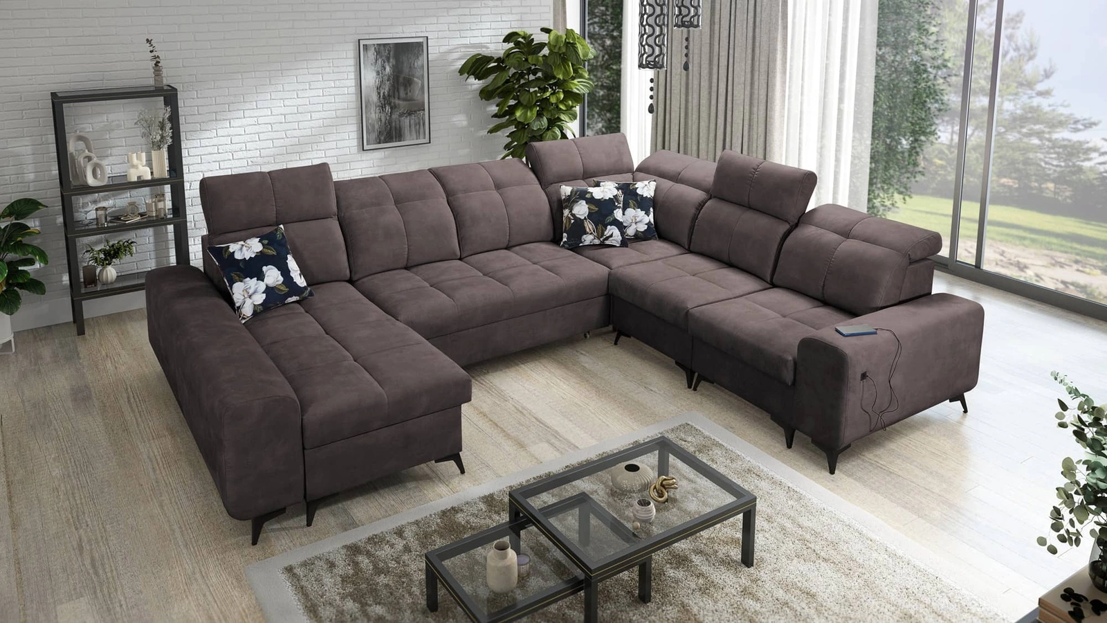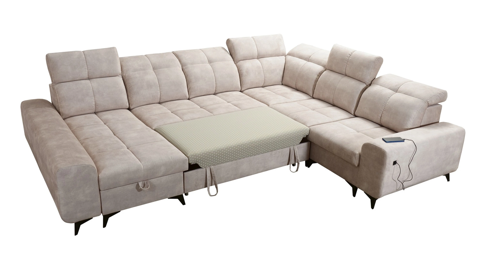 Dodatki tego mebla, które docenią wszyscy użytkownicy to aż trzy pojemniki na pościel, regulowane zagłówki oraz gniazdo ładowania USB w boczku narożnika.
