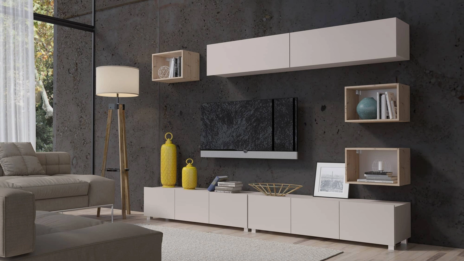 Meblościanka Apulia w kolorze beżowym to nowoczesny design mebla, który stanie się stylowym wykończeniem wnętrza.