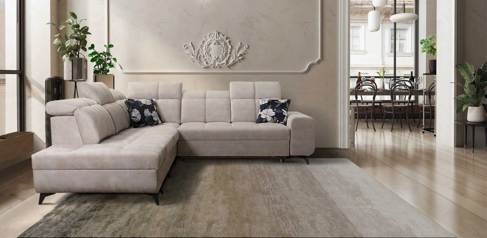 Narożnik z funkcją spania Buffalo IX beżowy lewostronny stylowy narożnik do pokoju wykonany z welurowej tkaniny ozdobne poduszki