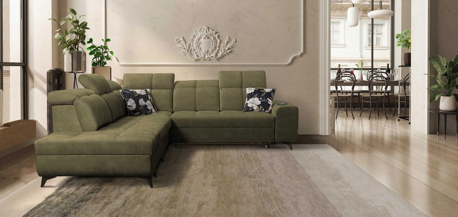 Narożnik z funkcją spania Buffalo IX oliwkowy lewostronny stylowy narożnik do pokoju wykonany z welurowej tkaniny ozdobne poduszki