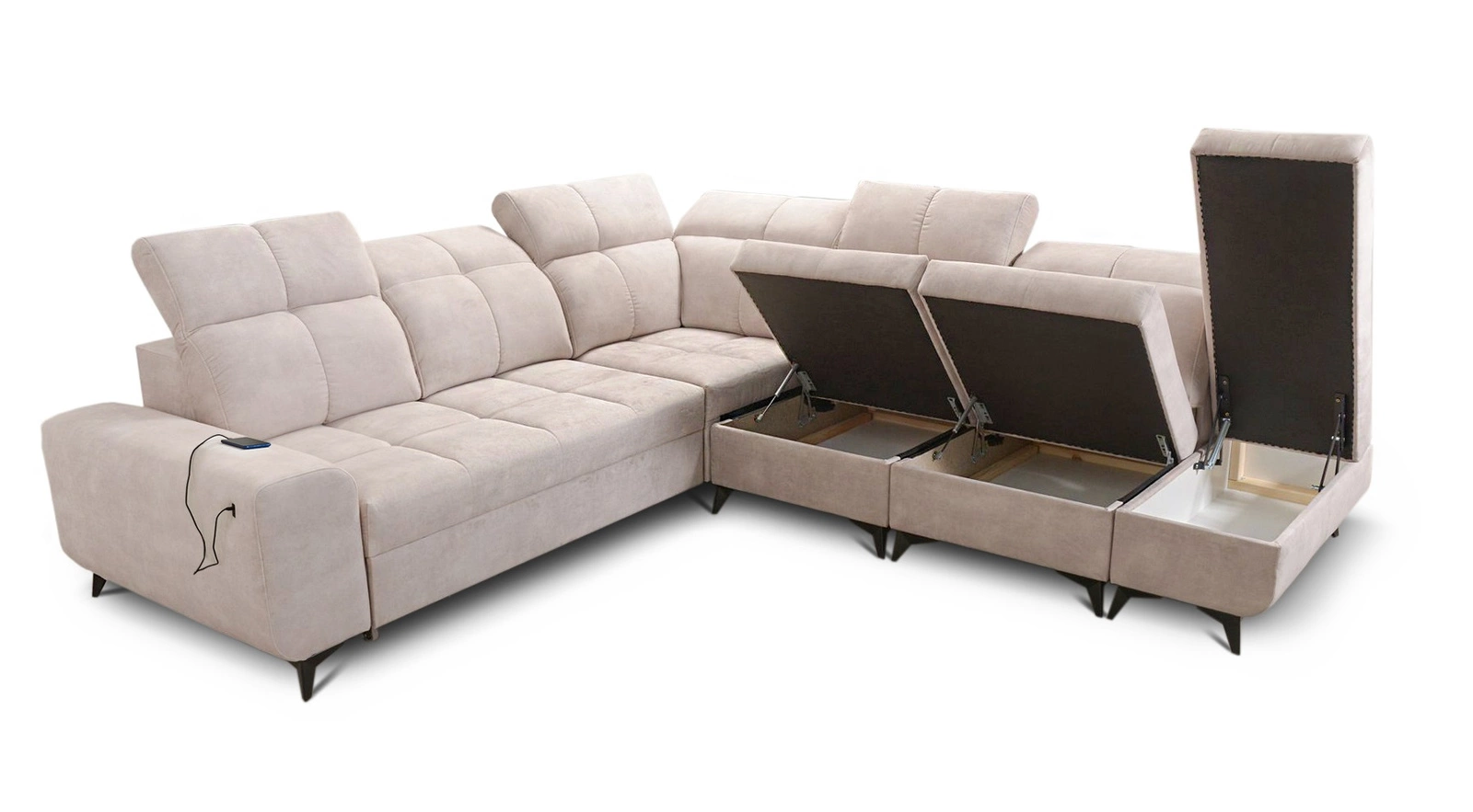 Dodatki tego mebla, które docenią wszyscy użytkownicy to trzy pojemniki na pościel, regulowane zagłówki oraz gniazdo ładowania USB w boczku narożnika.