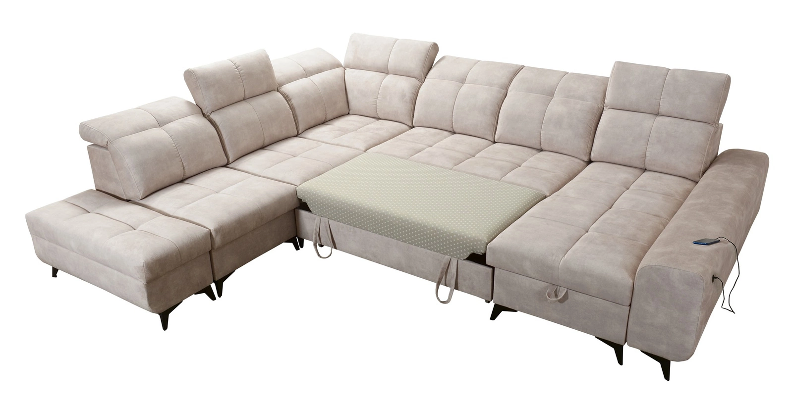 Dodatki tego mebla, które docenią wszyscy użytkownicy to aż siedem regulowanych zagłówków, cztery pojemniki na pościel oraz gniazdo ładowania USB w boczku narożnika.