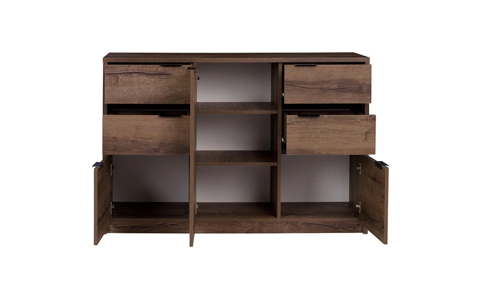 Komoda jest skonstruowana z 3 drzwi i 4 szufladKomoda z szufladami Denver została zaprojektowana w sposób funkcjonalny i użytkowy, oferując dużo miejsca do przechowywania. Kontrastowa i wyrazista kolorystyka świetnie odnajdzie się w klasycznych aranżacjach, dzięki czemu komoda z szufladami Denver świetnie sprawdzi się w roli komody do salonu o eleganckim wykończeniu, komody do pokoju dziennego lub komody do sypialni w nowoczesnym stylu. Komoda z szufladami z powodzeniem odnajdzie się także jako mebel biurowy.