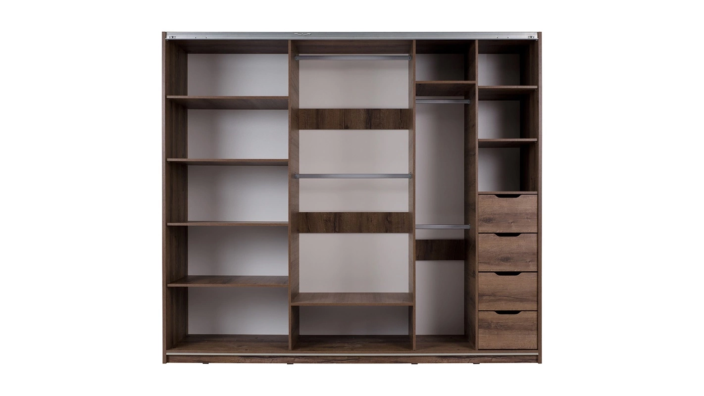 Szafa Denver dzieli się na część z czterema drążkami i część z półkami. Wnętrze szafy zostało wyposażone również w cztery szuflady, dodatkowo powiększając przestrzeń do przechowywania. Duże lustro optycznie powiększy i rozjaśni pomieszczenie. Szafa wykonana została z wysokiej jakości płyty laminowanej, która charakteryzuje się odpornością na wpływ czynników zewnętrznych takich jak obicia, uderzenia i niefortunne zadrapania. Precyzyjne wykończenie i dbałość o detale sprawiają, że szafa do przedpokoju Denver zachowa swój piękny wygląd na wiele lat, nie tracąc przy tym na funkcjonalności.