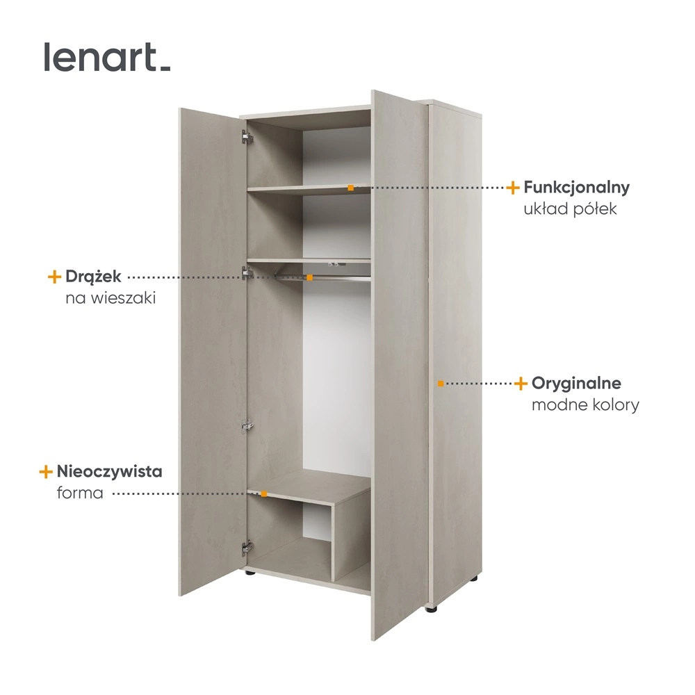 Szafa do pokoju młodzieżowego jest skonstruowana z 2 drzwi. Solidne i staranne wykończenie sprawia, że mebel będzie służyć przez wiele lat, zachowując swoją funkcjonalność i estetykę. Modna szarość sprawia, że szafa ubraniowa z powodzeniem sprawdzi się jako szafa do pokoju dziecięcego, szafa do sypialni lub jako szafa do przedpokoju. Szafa uchylna będzie także świetnym wyborem do pokoju niemowlęcego. Doskonale sprawdzi się także w roli garderoby do przedpokoju.