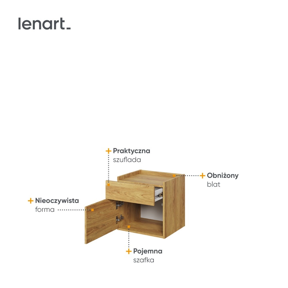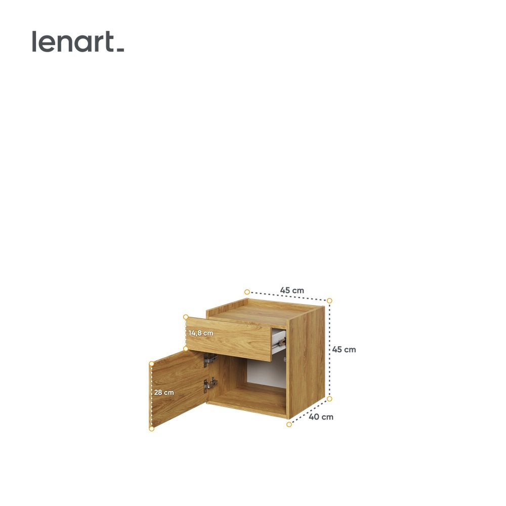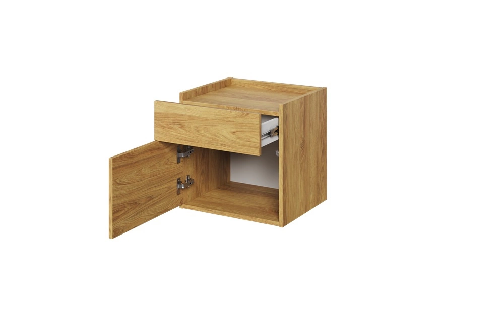 Szafka nocna jest skonstruowana z 1 szuflady oraz 1 drzwi. Solidne i staranne wykończenie sprawia, że mebel będzie służyć przez wiele lat, zachowując swoją funkcjonalność i estetykę. Drewnopodobny wzór sprawia, że szafki nocne do sypialni z kolekcji Teen Flex sprawdzą się także jako szafka nocna loft lub szafka nocna dla nastolatka.