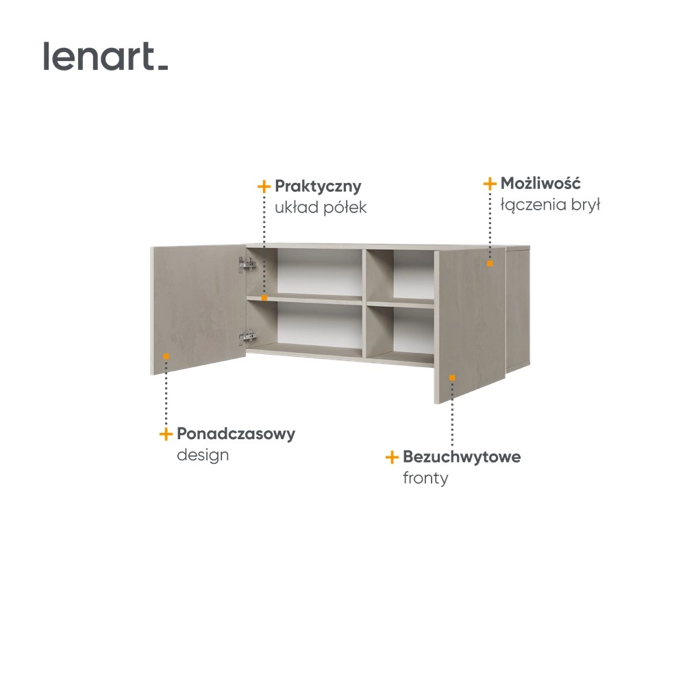 Półka wisząca Teen Flex została zaprojektowana w sposób funkcjonalny i użytkowy, oferując dużo miejsca do przechowywania. Dzięki nowoczesnemu designowi, szafka stanie się ważnym akcentem aranżacji wnętrza. Meble młodzieżowe Teen Flex zostały wykonane z solidnych materiałów, odpornych na uszkodzenia zapewniając niezawodność podczas codziennego użytkowania. Dodatkowym atutem mebla są bezuchwytowe fronty, które uwydatniają minimalistyczny design.