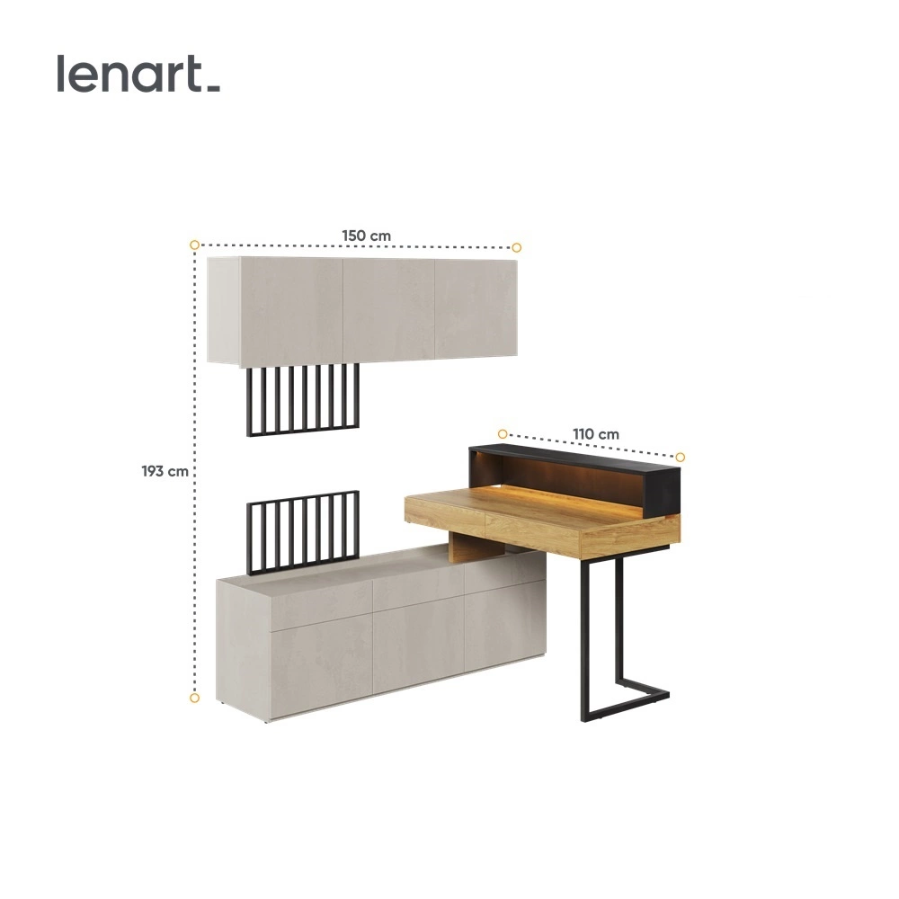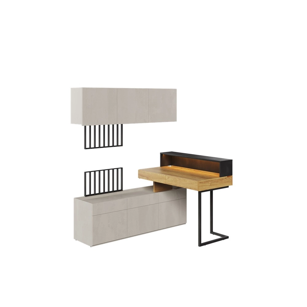 Odpowiednia wysokość biurka, duża przestrzeń robocza i pojemne szuflady to główne elementy oferujące komfort nie tylko podczas nauki i pracy, ale także do twórczych działań oraz chwili wytchnienia. Metalowa podstawa o oryginalnym kształcie nadaje wizualnej lekkości oraz doskonale oddaje nowoczesny charakter biurka. Delikatnie obniżony blat szafki to nie tylko designerski detal, ale również sposób na zabezpieczenie wyeksponowanych dekoracji przed upadkiem. Szafka wisząca została zaprojektowana w sposób funkcjonalny i użytkowy, oferując dużo miejsca do przechowywaniaNadstawka do biurka, a także dekoracyjny panel ścienny z lamelami wyposażone w modne oświetlenie ledowe o energetyzującej barwie, które podkreśla modernistyczny styl meblościanki do pokoju nastolatka.