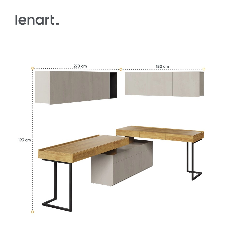 Odpowiednia wysokość biurka, duża przestrzeń robocza i pojemne szuflady to główne elementy oferujące komfort nie tylko podczas nauki i pracy, ale także do twórczych działań oraz chwili wytchnienia. Metalowa podstawa o oryginalnym kształcie nadaje wizualnej lekkości oraz doskonale oddaje nowoczesny charakter biurka. Delikatnie obniżony blat szafki to nie tylko designerski detal, ale również sposób na zabezpieczenie wyeksponowanych dekoracji przed upadkiem. Szafki wiszące zostały zaprojektowana w sposób funkcjonalny i użytkowy, oferując dużo miejsca do przechowywania.