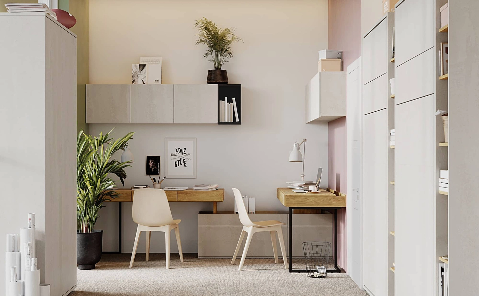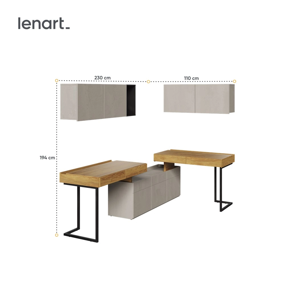 Odpowiednia wysokość biurka, duża przestrzeń robocza i pojemne szuflady to główne elementy oferujące komfort nie tylko podczas nauki i pracy, ale także do twórczych działań oraz chwili wytchnienia. Metalowa podstawa o oryginalnym kształcie nadaje wizualnej lekkości oraz doskonale oddaje nowoczesny charakter biurka. Delikatnie obniżony blat szafki to nie tylko designerski detal, ale również sposób na zabezpieczenie wyeksponowanych dekoracji przed upadkiem. Szafki wiszące zostały zaprojektowana w sposób funkcjonalny i użytkowy, oferując dużo miejsca do przechowywania.