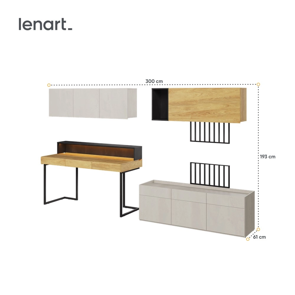Meblościanka Teen Flex hikora naturalna / silk flou / raw steel designerskie meble z dużym biurkiem wpisujące się w trendy aranżacyjne