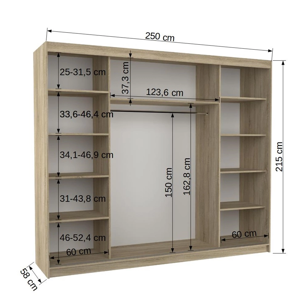 Wnętrze szafy Salto wyposażone jest w drążek na ubrania wiszące i półki. Środkowe drzwi zostały wykończone dużym lustrem. Szafy do sypialni z kolekcji Salto wykonane są z wysokiej jakości płyty laminowanej o grubości 16mm, która charakteryzuje się odpornością na wpływ czynników zewnętrznych takich jak obicia, uderzenia i niefortunne zadrapania. Stylowym wykończeniem drzwi szafy są srebrne uchwyty, które poza swoją podstawową funkcją, nadają niezwykle gustownego wyglądu.