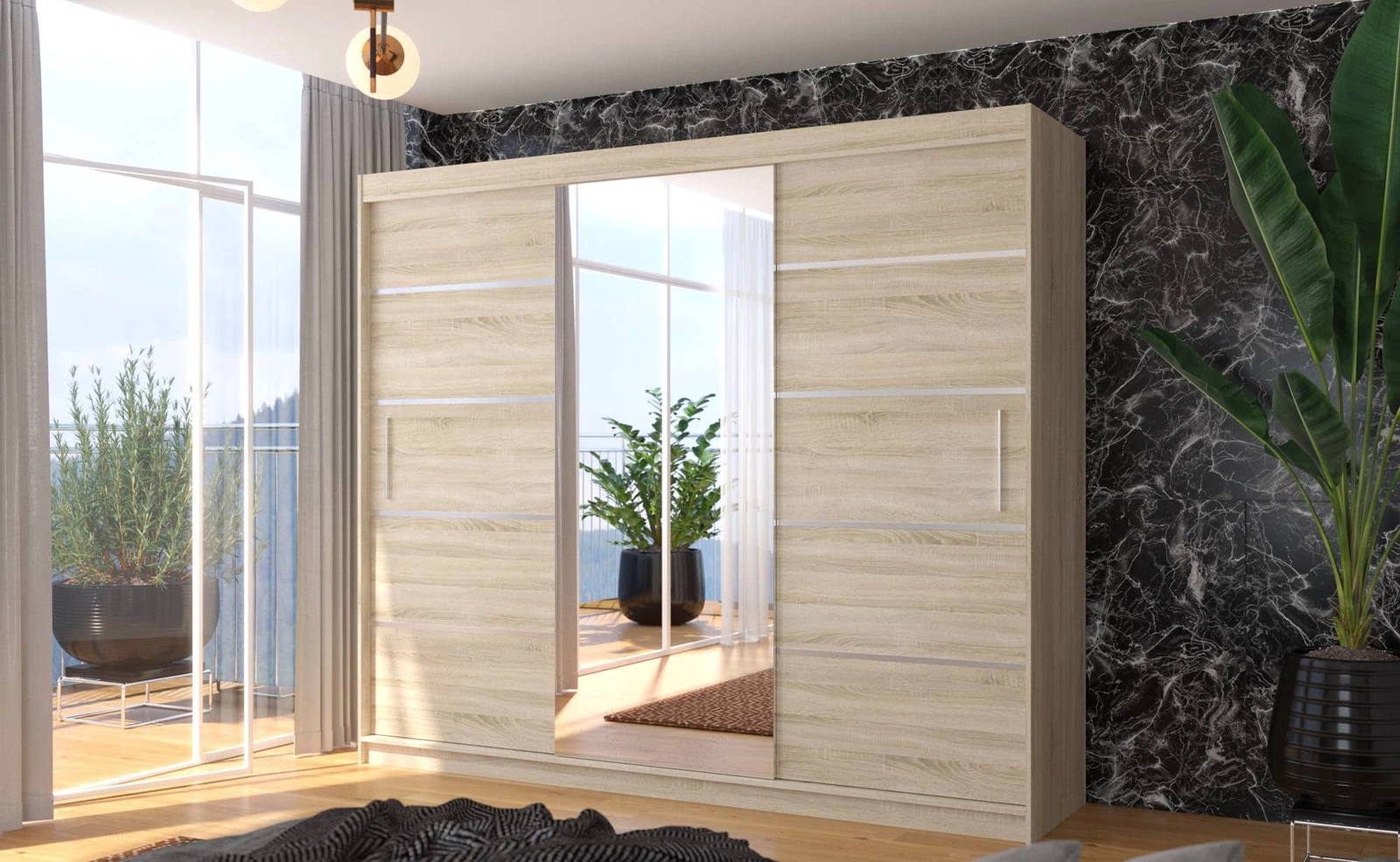 Szafa przesuwna z lustrem Salto 250 cm w kolorze dąb sonoma jasny to niezbędny element wyposażenia, który odnajdzie się w wielu aranżacjach.