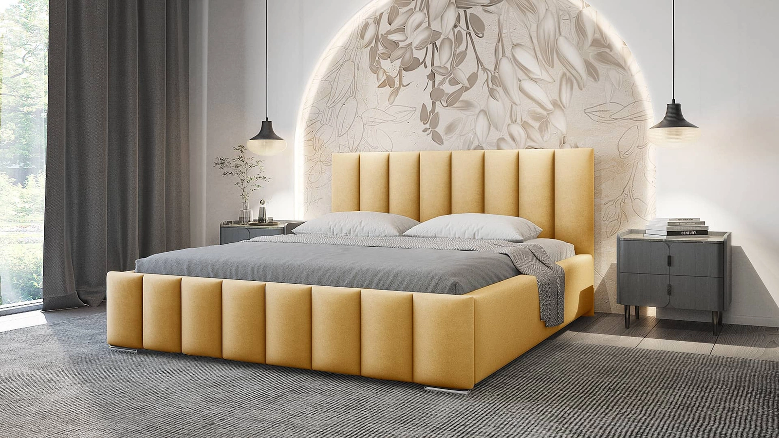 Łóżko tapicerowane Foggo 160x200 w kolorze miodowym to idealne rozwiązanie do sypialni urządzonej w stylu nowoczesnym, skandynawskim oraz klasycznym.