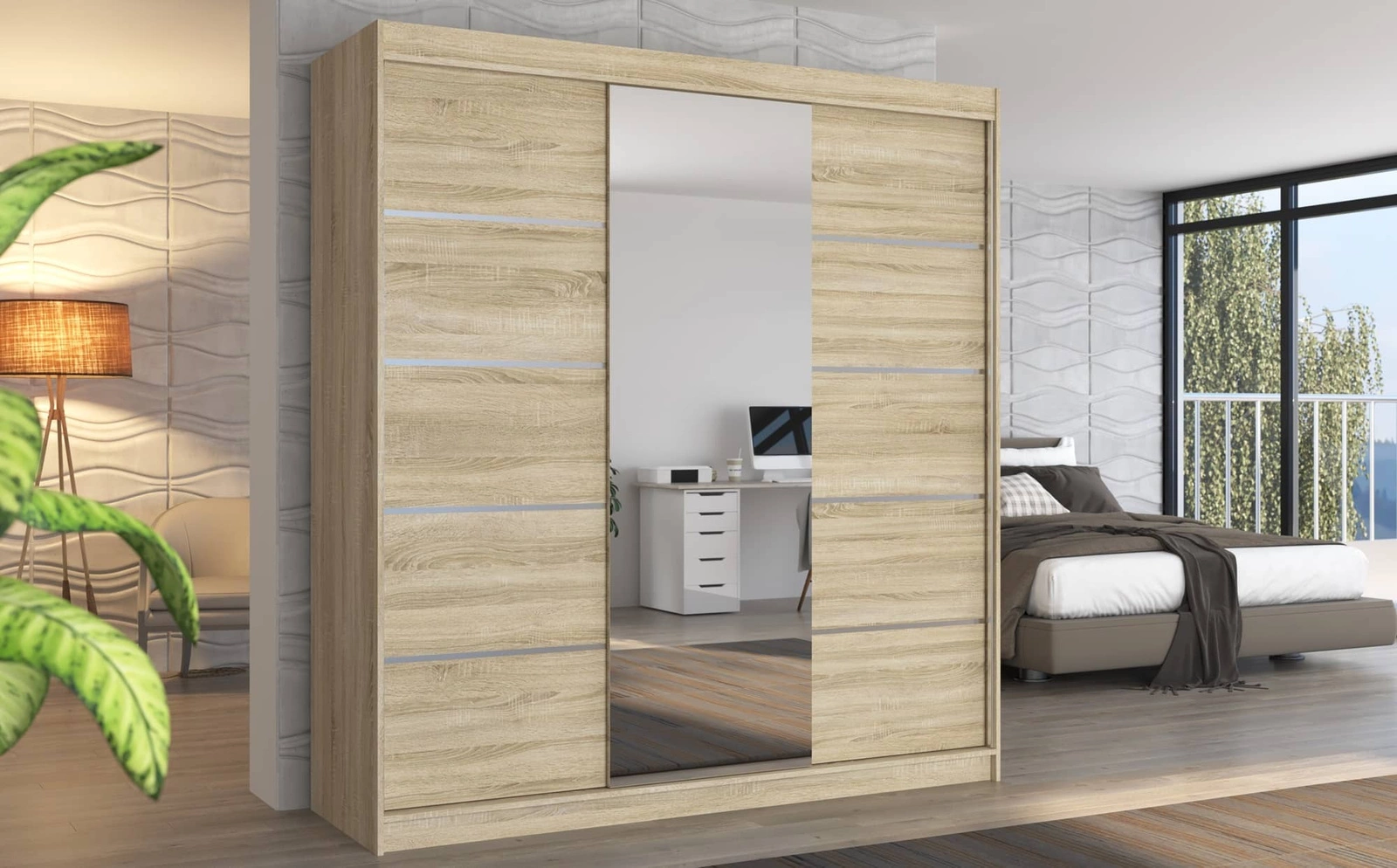 Szafa jest skonstruowana z 3 drzwi. Szafa gwarantuje komfortowe i bezproblemowe korzystanie oraz trwałość całego mebla przez wiele lat użytkowania. Prosty design sprawia, że szafa na ubrania z powodzeniem sprawdzi się jako szafa z lustrem do sypialni, jako szafa do przedpokoju lub szafa do pokoju dziecięcego. Szafa przesuwna Bergen będzie również świetnym wyborem do pokoju niemowlęcego. Doskonale sprawdzi się także w roli garderoby do przedpokoju.