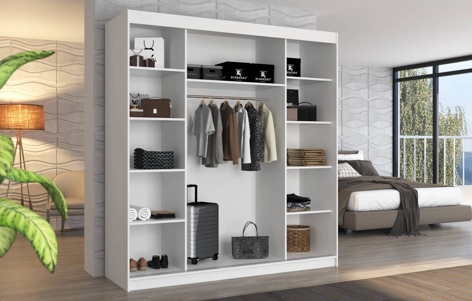 Szafa przesuwna Bergen została zaprojektowana z myślą o praktycznym podejściu do organizacji przestrzeni. Imponująca pojemność szafy pozwoli na harmonijne uprządkowanie każdej garderoby oraz niezbędnych akcesoriów, zachowując przy tym estetykę i elegancję. Modna kolorystyka, a także staranne wykończenie szafy zapewni niebanalny akcent stylistyczny w każdym wnętrzu. Obecność szafy stanie się stylowym wykończeniem sypialni lub garderoby oraz nada niepowtarzalnego klimatu. Na drzwiach szafy znajdują się poziome listwy w kolorze srebrnym, które nadają wyjątkowego stylu. Szafa na ubrania Bergen z powodzeniem odnajdzie się we wnętrzach w stylu klasycznym jak i nowoczesnym.