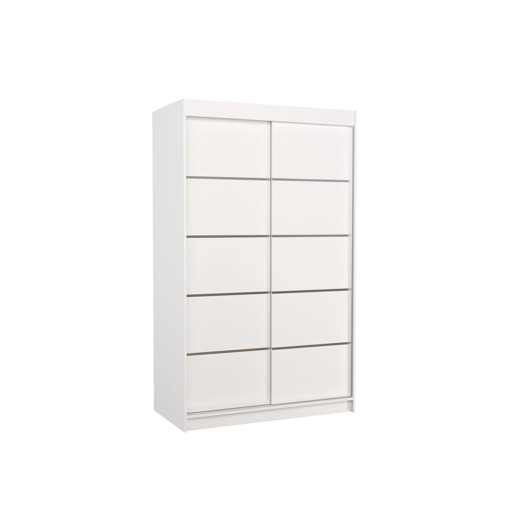 Szafa przesuwna Benisso 120 cm biała praktyczna i funkcjonalna szafa do sypialni fronty wykończone poziomymi srebrnymi listwami
