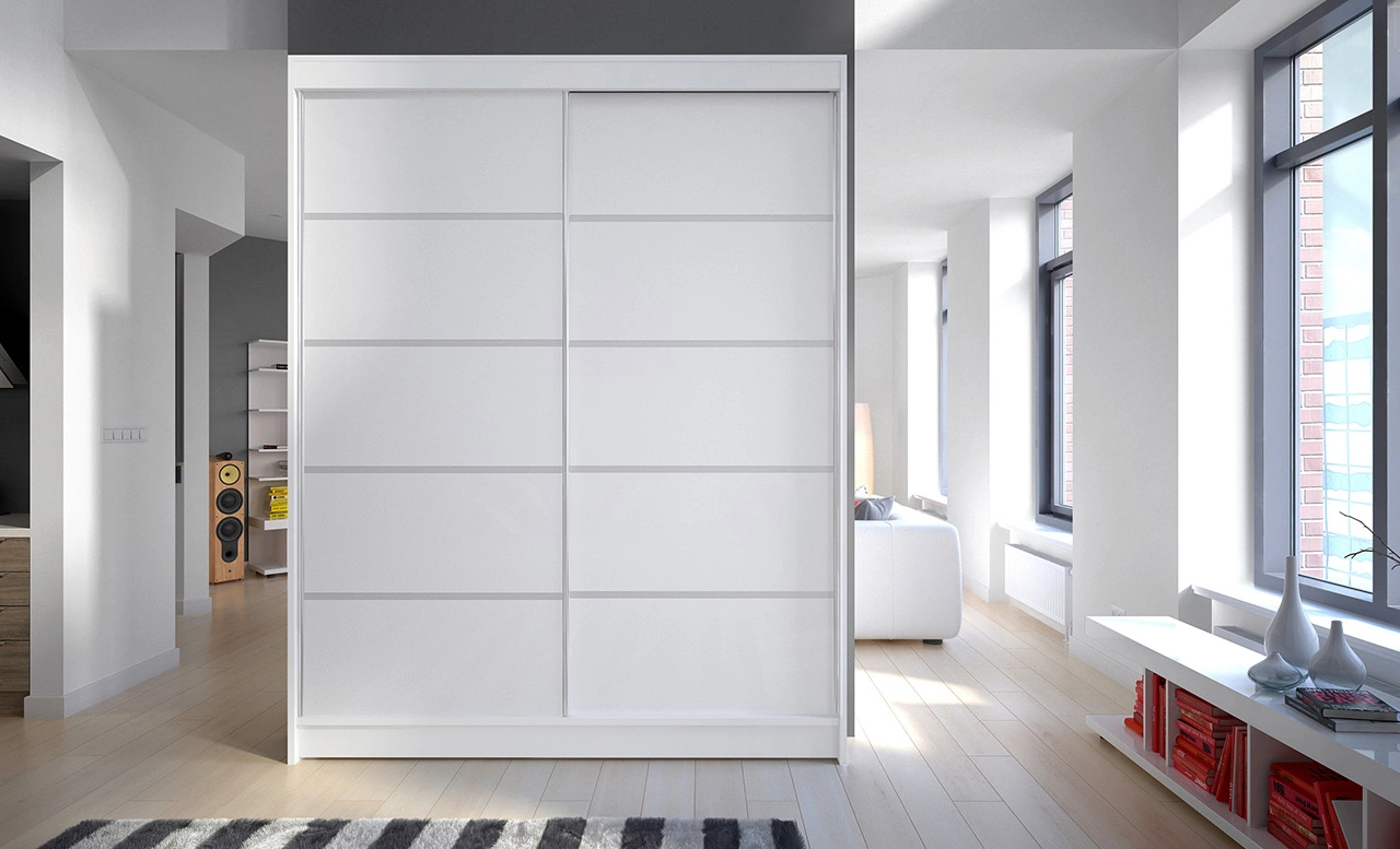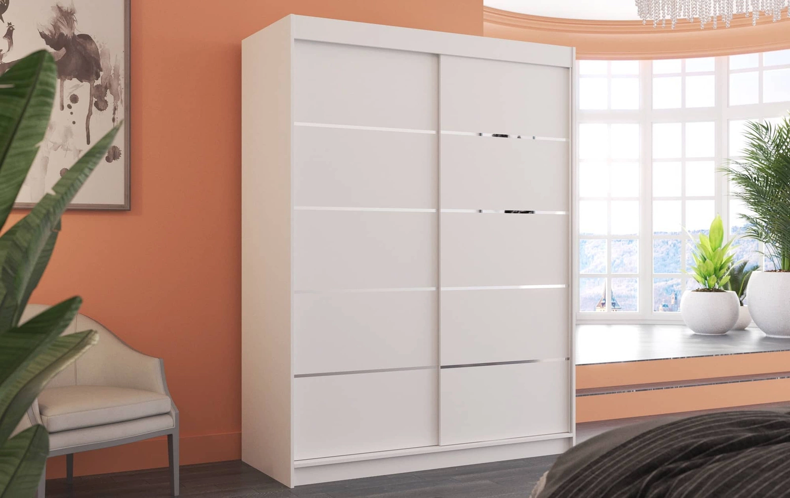 Szafa przesuwna Luft 150 cm biała praktyczna i funkcjonalna szafa do sypialni fronty wykończone poziomymi srebrnymi listwami