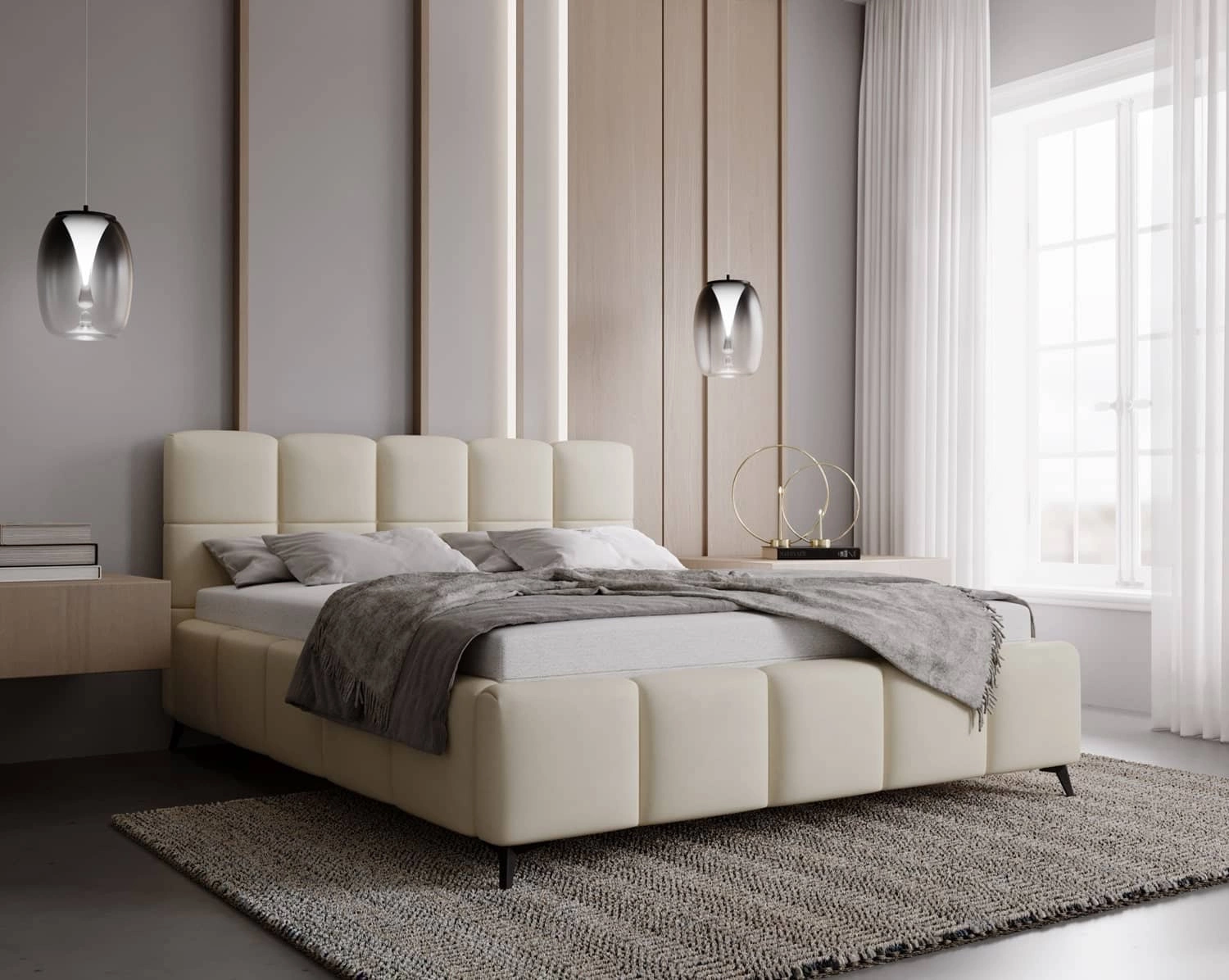 Łóżko wykonane z tkaniny typu velvet Amor Velvet 4323 gwarantuje najwyższy komfort i funkcjonalność podczas codziennego wypoczynku w sypialni. Tkanina posiada powłokę hydrofobową, co gwarantuje ograniczone wchłanianie cieczy. Tkanina wykazuje także wysoką odporność na płowienie co idealnie sprawdza się przy bardzo nasłonecznionych aranżacjach wnętrz. Niezwykle miękki, gładki materiał obiciowy Amor Velvet wyróżnia przyjemna i aksamitna w dotyku powierzchnia. Dzięki wszystkim właściwościom użytej tkaniny, łóżko na długo zachowa swój pierwotny wygląd. Konstrukcja łóżka zapewnia dużą stabilność i wygodę użytkowania. Rama łóżka jest wykonana z drewna oraz płyty meblowej. Przeszycia na wezgłowiu i ramie łóżka przyciągą wzrok i nadają łóżku szczególnego charakteru.