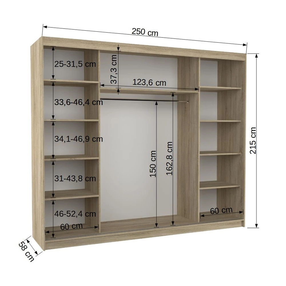 Szafa przesuwana skonstruowana jest z 3 drzwi. Szafa do sypialni gwarantuje komfortowe i bezproblemowe korzystanie oraz trwałość całego mebla przez wiele lat użytkowania. Prosty design sprawia, że szafa na ubrania z powodzeniem sprawdzi się jako szafa do sypialni, jako szafa do przedpokoju lub szafa do pokoju młodzieżowego. Szafa Antos będzie również świetnym wyborem do biura. Doskonale sprawdzi się także w roli garderoby do przedpokoju.