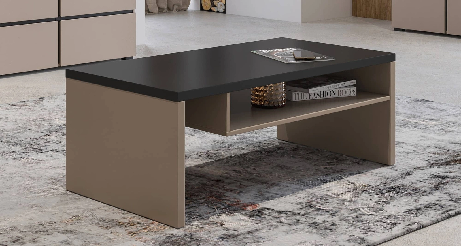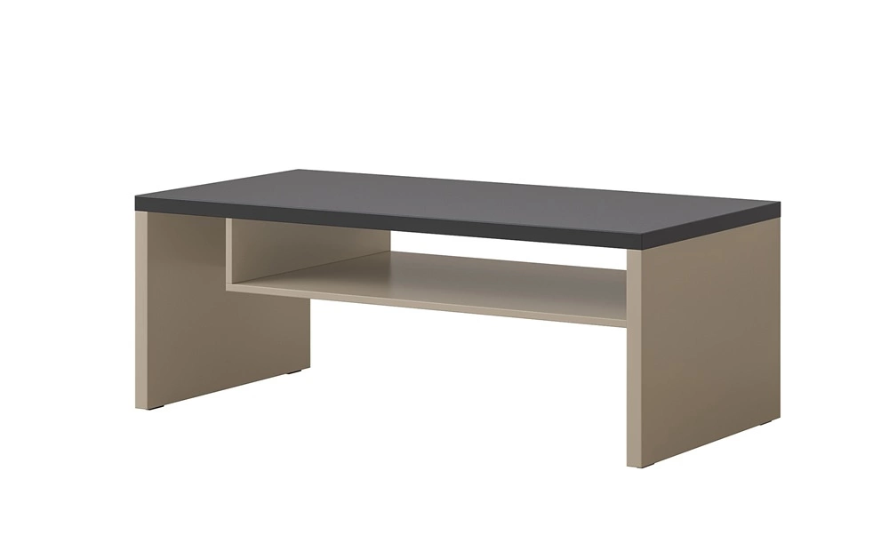 Stolik kawowy Cross zachwyci wszystkich miłośników wyrafinowanych aranżacji. Mebel wyróżnia się prostotą oraz elegancją, a także zaskakuje szeroką funkcjonalnością. Oryginalna kolorystyka i geometryczny kształt stworzy niepowtarzalny klimat w każdym wnętrzu. Modny beżowy w ciemnym odcieniu znakomicie współgra z blatem w kolorze czarnym nadając nowoczesnego wyglądu i kontrastu. Takie zestawienie kolorystyczne doskonale oddaje unikatowy charakter stolika kawowego.
