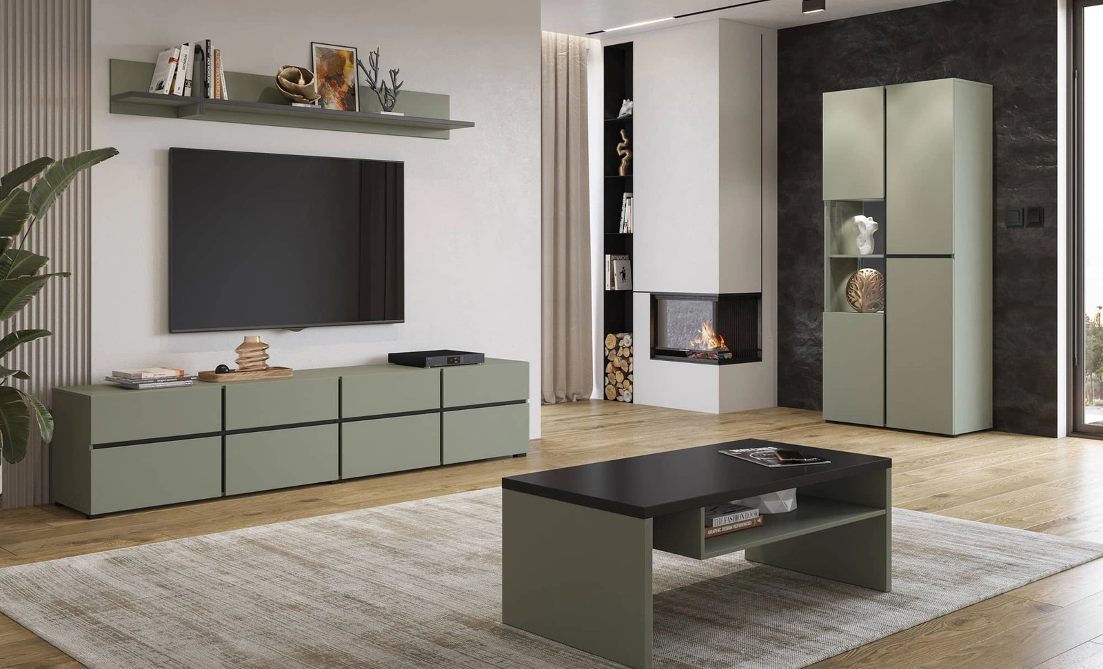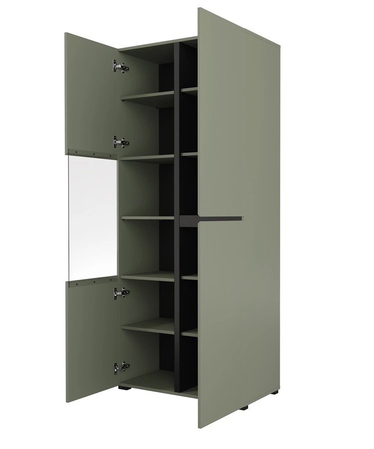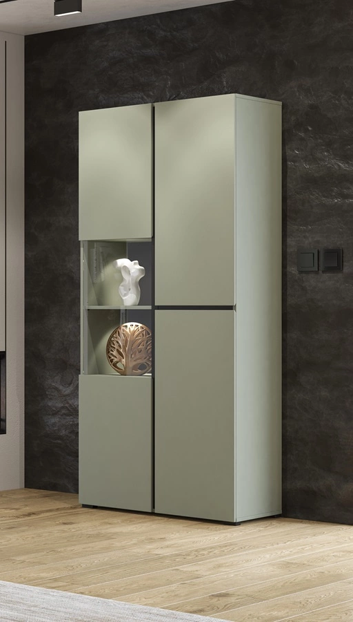 Witryna Cross zachwyci wszystkich miłośników wyrafinowanych aranżacji. Mebel wyróżnia się prostotą oraz elegancją, a także zaskakuje szeroką funkcjonalnością. Oryginalna kolorystyka i geometryczny kształt stworzy niepowtarzalny klimat w każdym wnętrzu. Modna zieleń znakomicie współgra z wstawkami w kolorze czarnym nadając meblom nowoczesnego wyglądu i kontrastu. Takie zestawienie kolorystyczne doskonale oddaje unikatowy charakter witryny. Nietuzinkowym wykończeniem frontów witryny do salonu są subtelnie frezowane uchwyty.