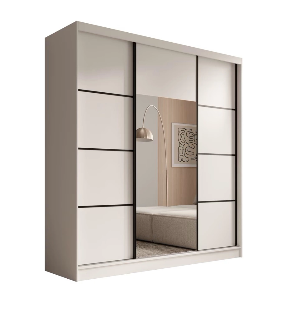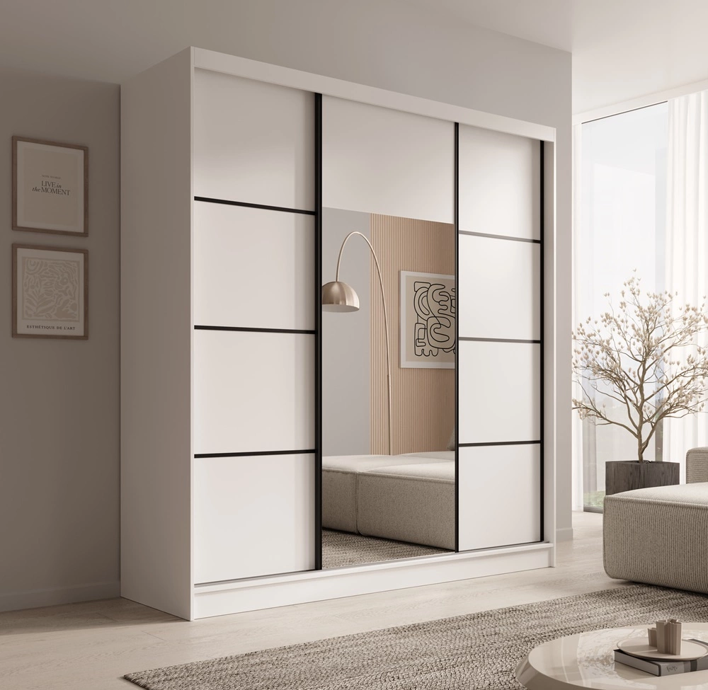 Szafa przesuwna z lustrem Keri 200 cm biała funkcjonalna szafa do nowoczesnego wnętrza dekoracyjne czarne listwy wewnętrzne szuflady