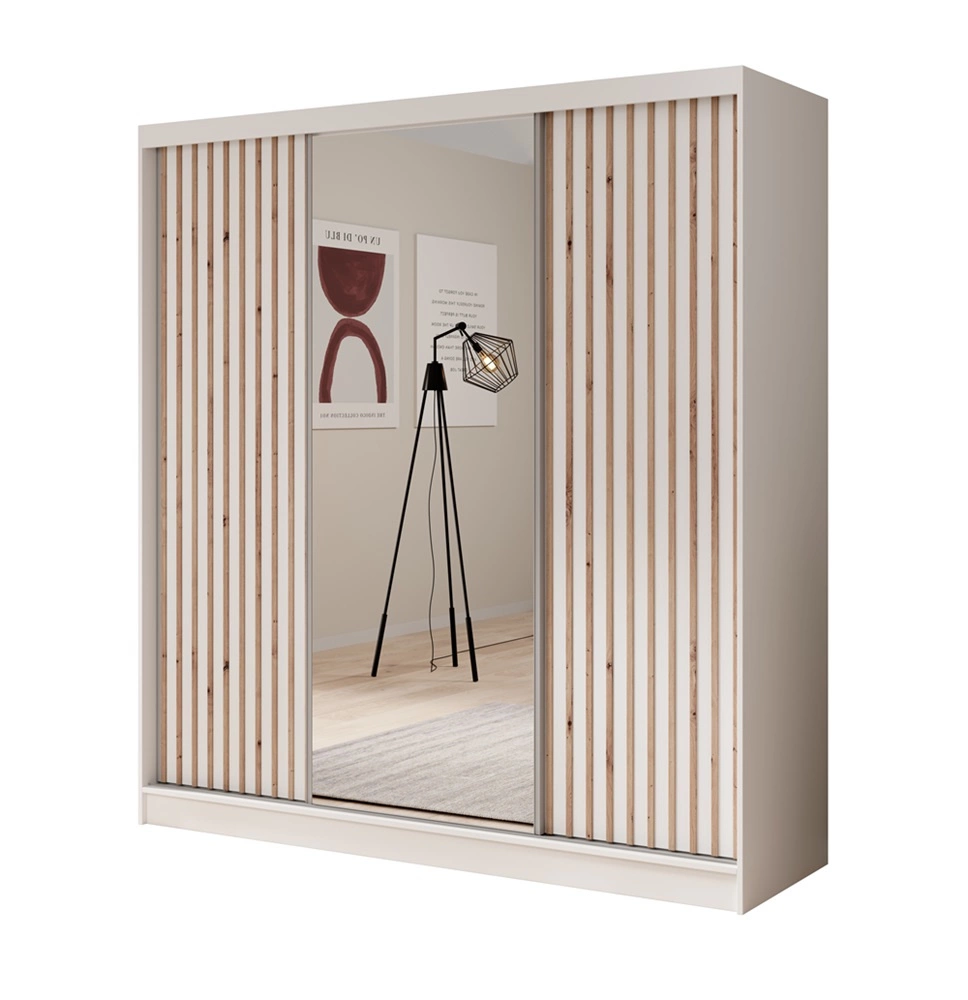 Szafa przesuwna z lustrem Ida 200 cm biała stylowe lamele zdobiące drzwi szafy wnętrze wyposażone w pojemne szuflady