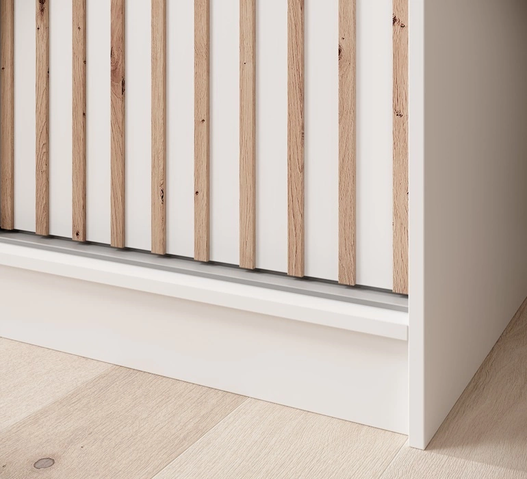 Szafa przesuwna z kolekcji Ida została zaprojektowana z myślą o praktycznym podejściu do organizacji przestrzeni. Przemyślany układ wnętrza szafy pozwoli na harmonijne uprządkowanie każdej garderoby oraz niezbędnych akcesoriów, zachowując przy tym estetykę i elegancję. Modna kolorystyka, a także staranne wykończenie szafy zapewni niebanalny akcent stylistyczny w każdym wnętrzu. Dodatkowym atutem mebla są stylowe lamele, które zdobią front szafy, dodając jej eleganckiego charakteru i nowoczesności. Obecność szafy stanie się stylowym wykończeniem sypialni lub garderoby oraz nada niepowtarzalnego klimatu. Szafa na ubrania Ida z powodzeniem odnajdzie się we wnętrzach w stylu klasycznym jak i nowoczesnym.