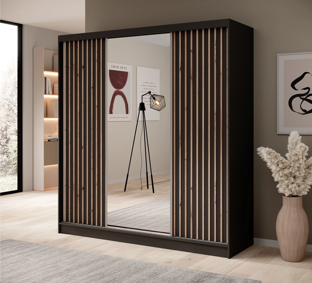 Szafa przesuwna z lustrem Ida 200 cm czarna stylowe lamele zdobiące drzwi szafy wnętrze wyposażone w pojemne szuflady