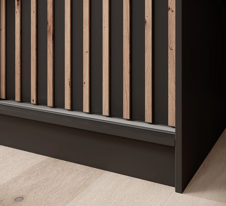 Szafa przesuwna z kolekcji Ida została zaprojektowana z myślą o praktycznym podejściu do organizacji przestrzeni. Przemyślany układ wnętrza szafy pozwoli na harmonijne uprządkowanie każdej garderoby oraz niezbędnych akcesoriów, zachowując przy tym estetykę i elegancję. Modna kolorystyka, a także staranne wykończenie szafy zapewni niebanalny akcent stylistyczny w każdym wnętrzu. Dodatkowym atutem mebla są stylowe lamele, które zdobią front szafy, dodając jej eleganckiego charakteru i nowoczesności. Obecność szafy stanie się stylowym wykończeniem sypialni lub garderoby oraz nada niepowtarzalnego klimatu. Szafa na ubrania Ida z powodzeniem odnajdzie się we wnętrzach w stylu klasycznym jak i nowoczesnym.