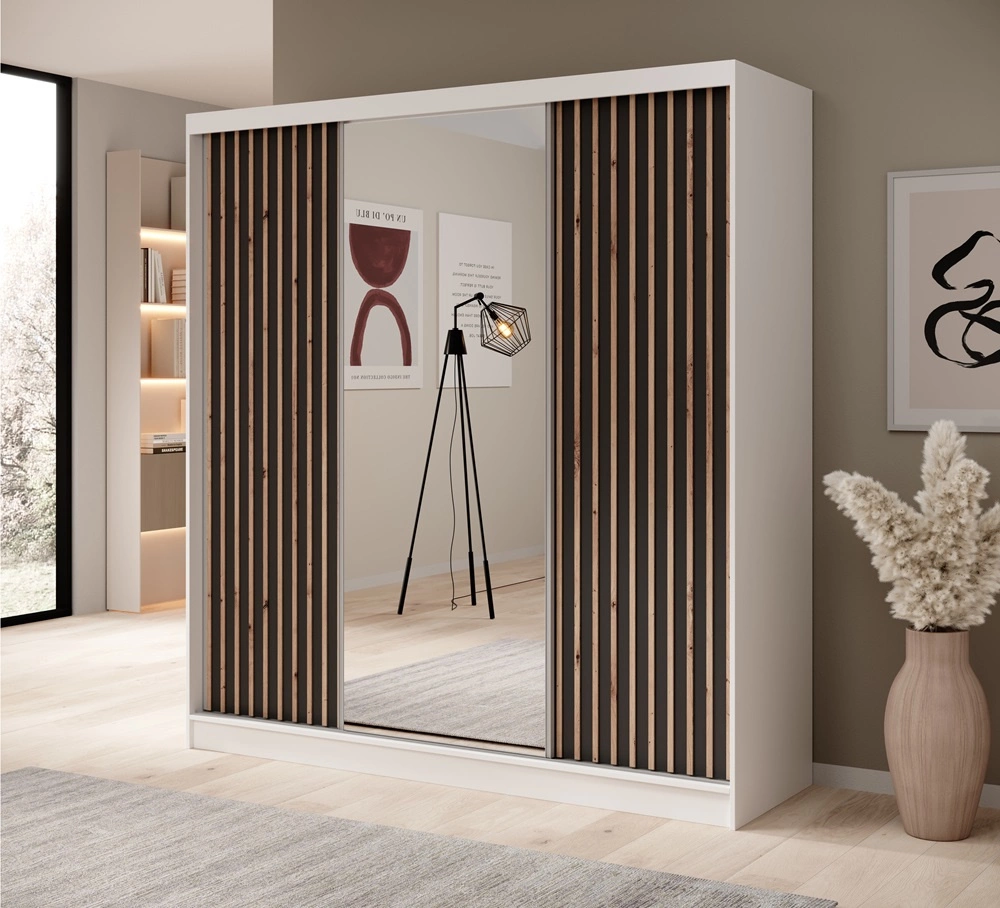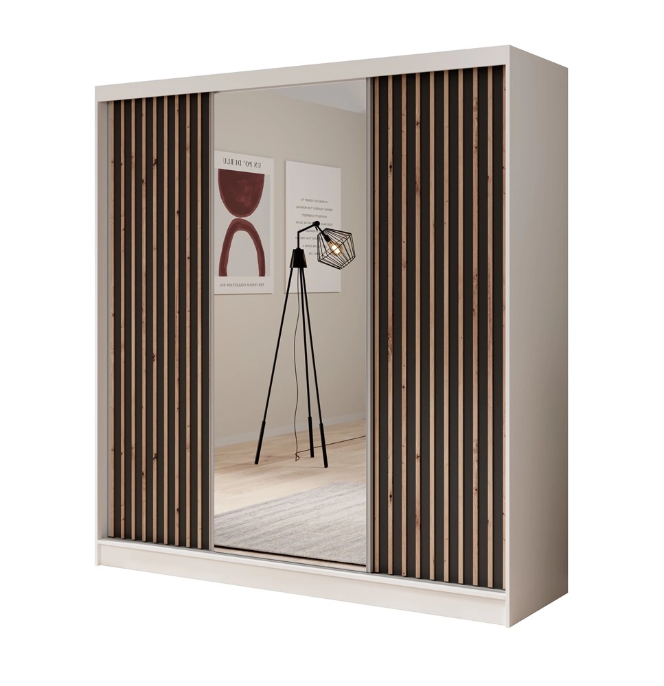 Szafa przesuwna z lustrem Ida 200 cm biały / czarny stylowe lamele zdobiące drzwi szafy wnętrze wyposażone w pojemne szuflady