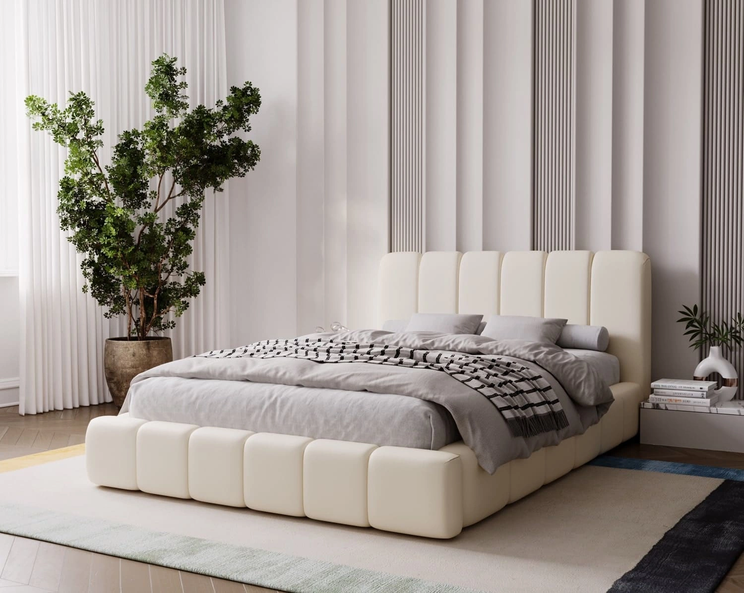 Łóżko tapicerowane Malmi 160x200 beżowe stylowe łóżko z pojemnikiem na pościel wygodny zagłówek zachwyca eleganckim designem